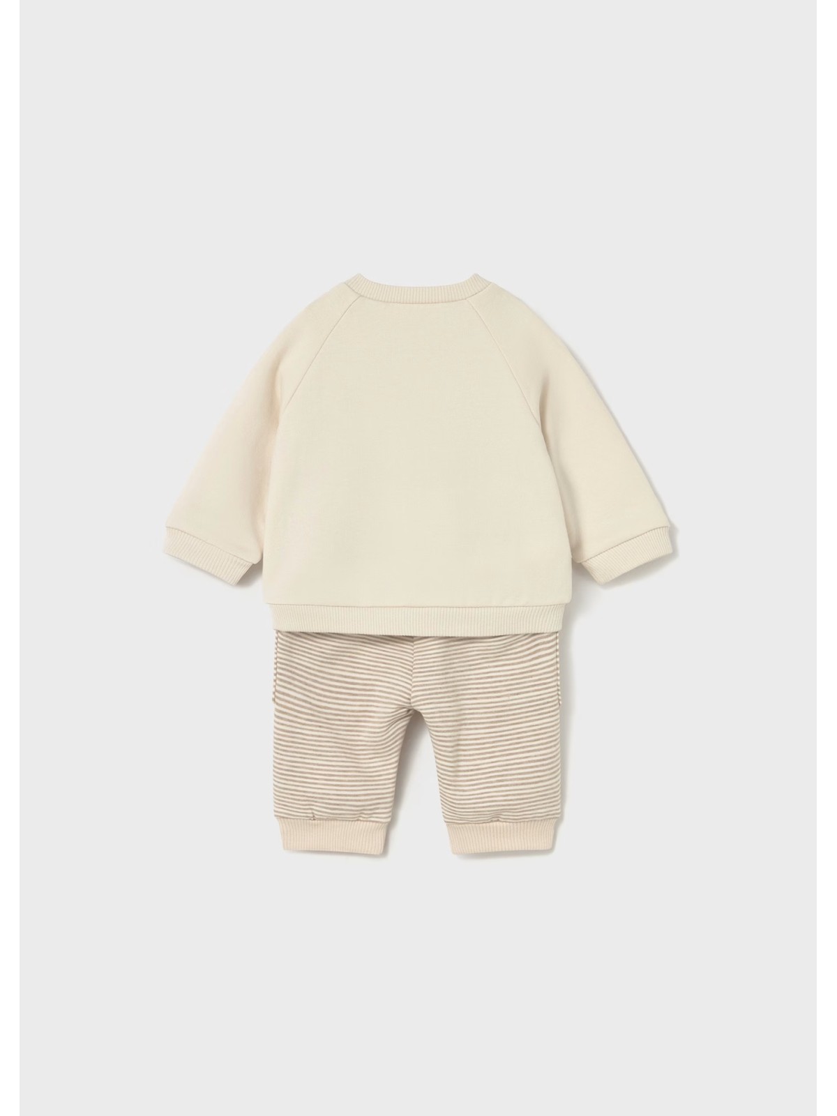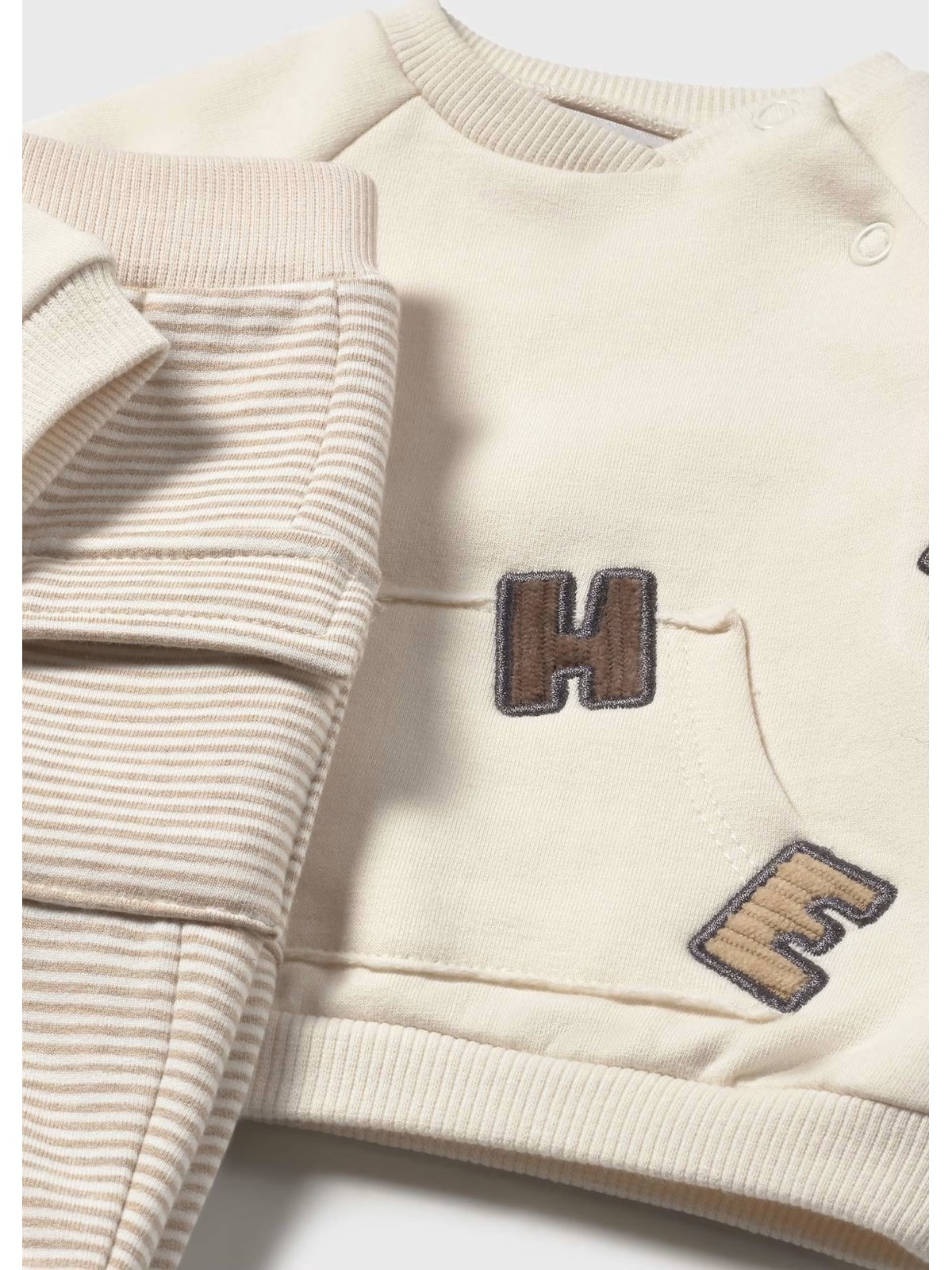 Completo per neonato costituito da felpa e pantalone lungo, due varianti disponibli. Felpa manica lunga per neonato. Girocollo. Chiusura laterale con bottoni a pressione. A partire dalla taglia 6-9, l'apertura laterale è sostituita da bottoni a pressione sulla spalla. Pantalone per neonato della linea sporty, molto comodo. Elastico in vita. Orlo elasticizzato per una migliore vestibilità.