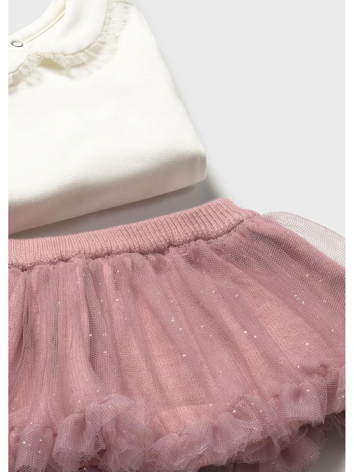 Originale completo per neonata tre pezzi. Cardigan manica lunga per neonata. Girocollo. Chiusura con bottoni nella parte anteriore. Design con volant nella parte bassa. Body manica lunga per neonata con polsini elasticizzati. Colletto bebè. Chiusura con bottoni a pressione nella parte posteriore. Chiusura con bottoni a pressione nell'interno cosce per agevolare la vestibilità. Elementi decorativi: volant decorativo. Gonna per neonato. Elastico in vita.