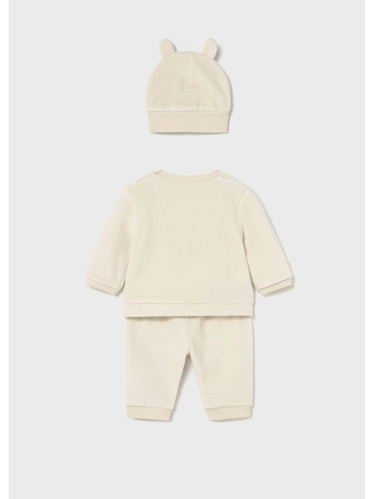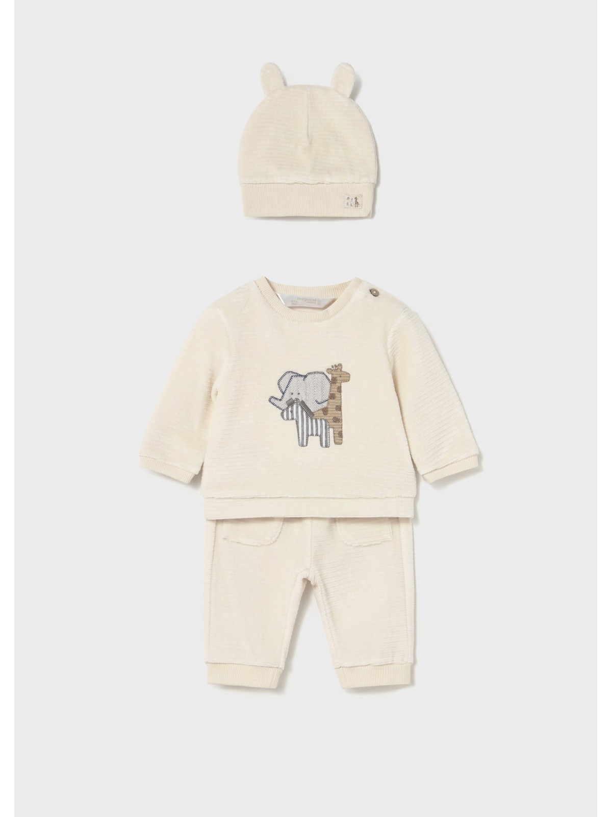 Originale completo per neonato tre pezzi. Felpa manica lunga per neonato. Girocollo. Bottone sulla spalla per facilitare la vestibilità del capo. Elementi decorativi: applicazioni decorative, ricami Pantalone per neonato della linea sporty, molto comodo. Elastico in vita. Tasche funzionali nella parte anteriore. Cappello neonato in tessuto caldo e flessibile che garantisce una vestibilità comoda e protegge dal freddo. Elementi decorativi: applicazione orecchie.