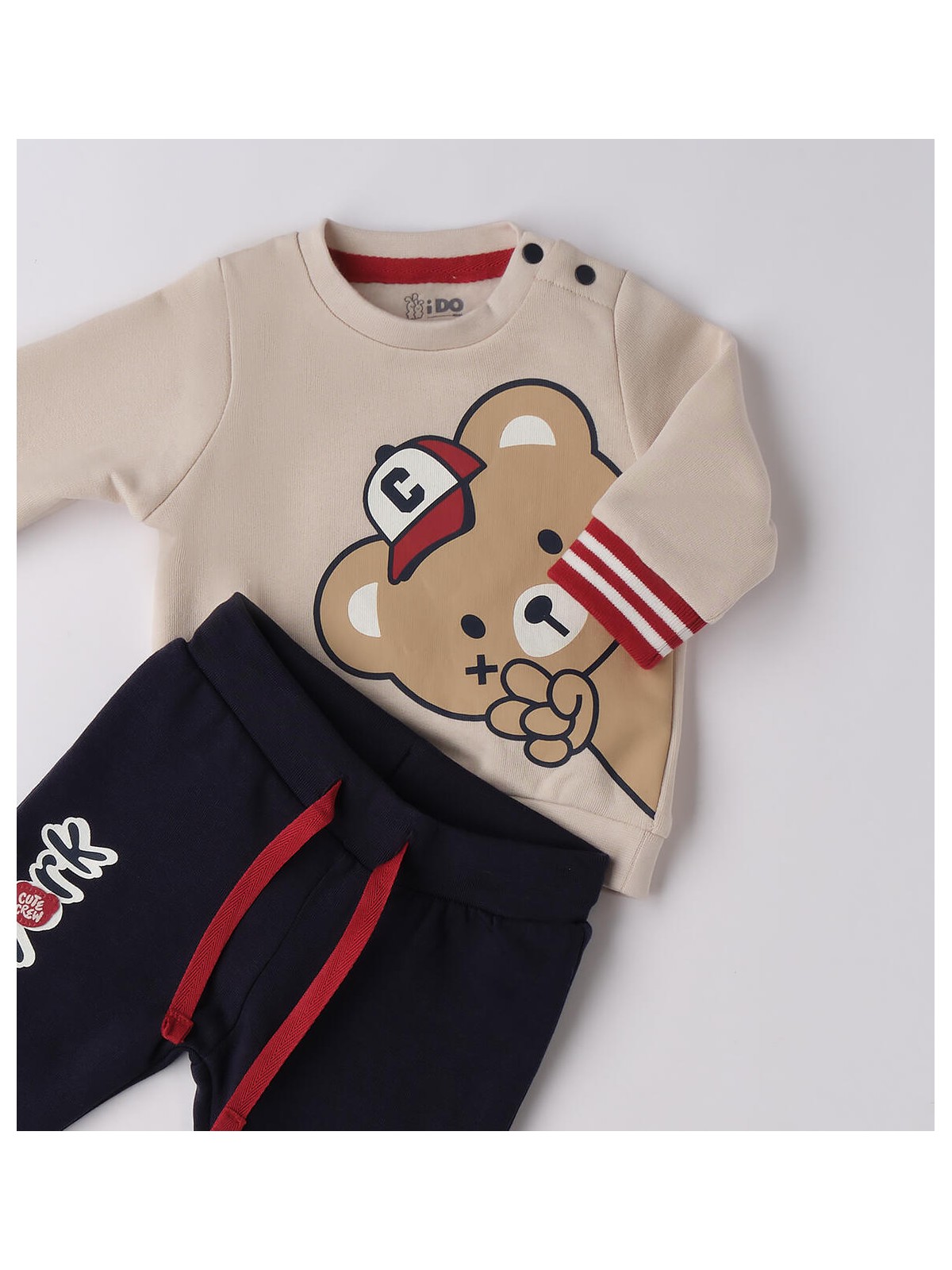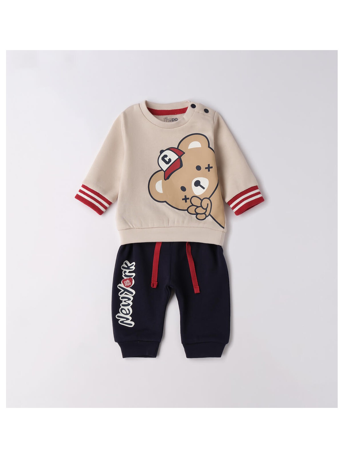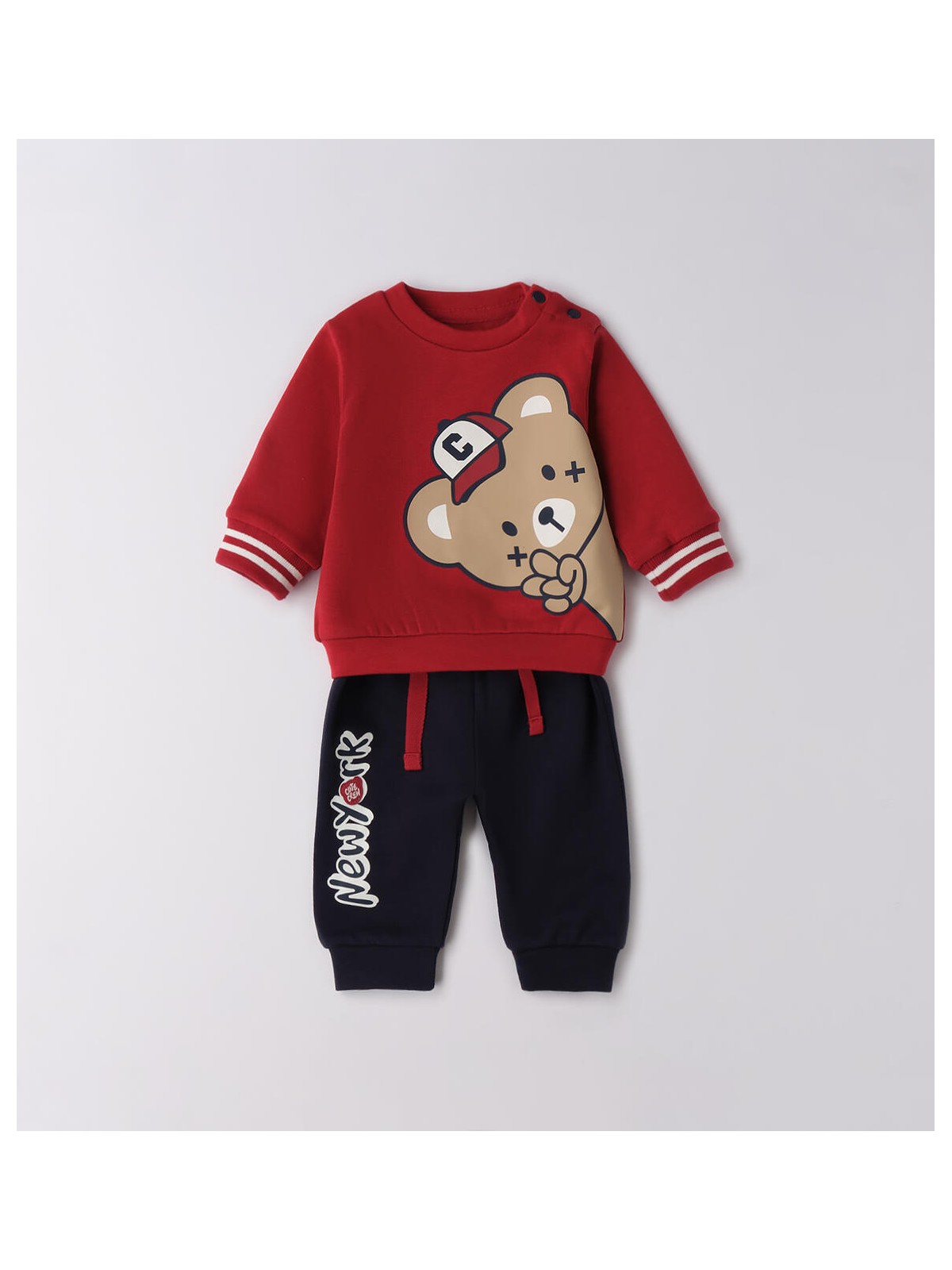 Completo bimbo realizzato in cotone felpato invernale. La felpa ha l'apertura sulla spalla con bottoni a pressione e stampa frontale. I pantaloni hanno vita elasticizzata con coulisse e fantasia tinta unita con stampa.