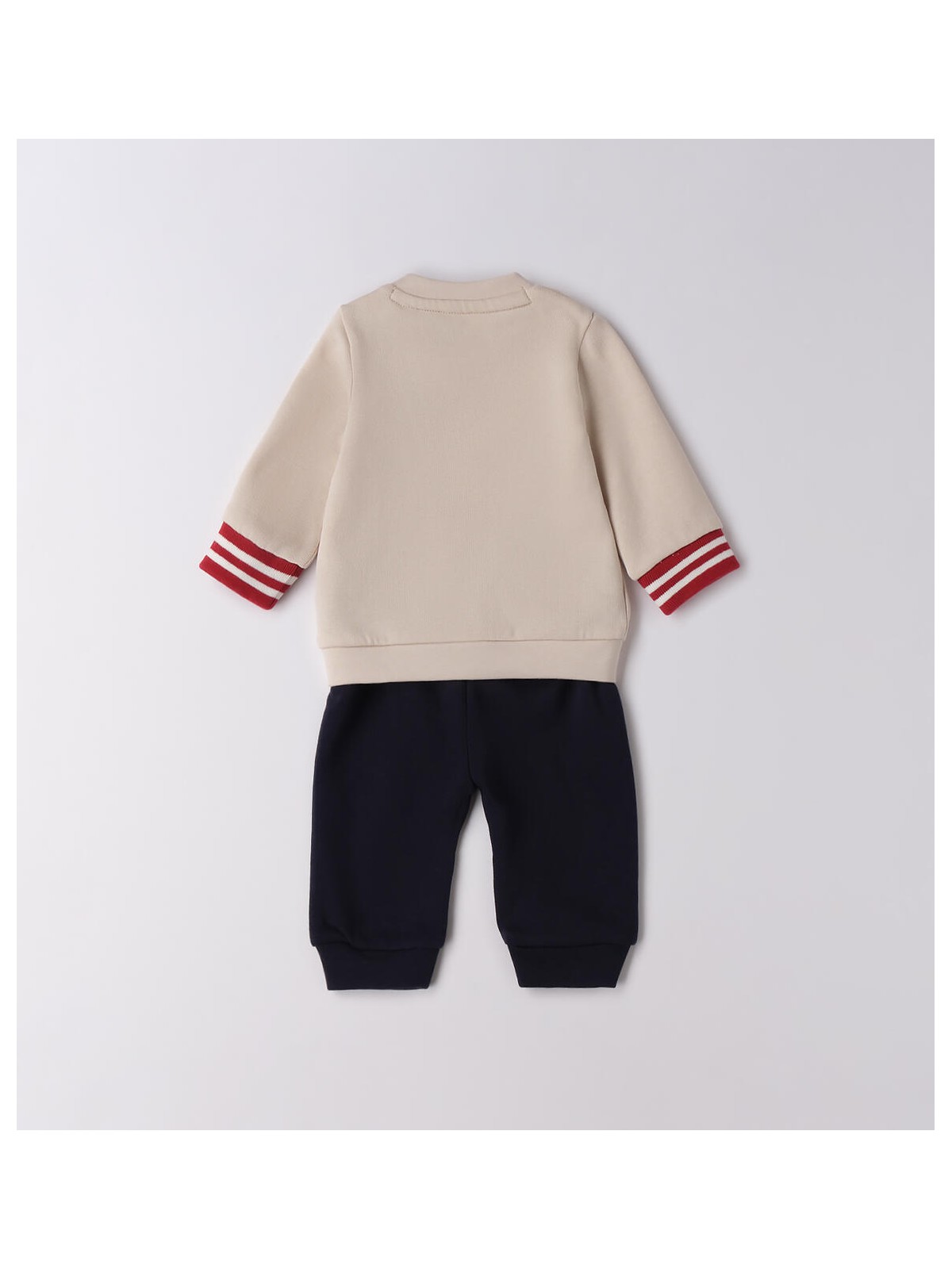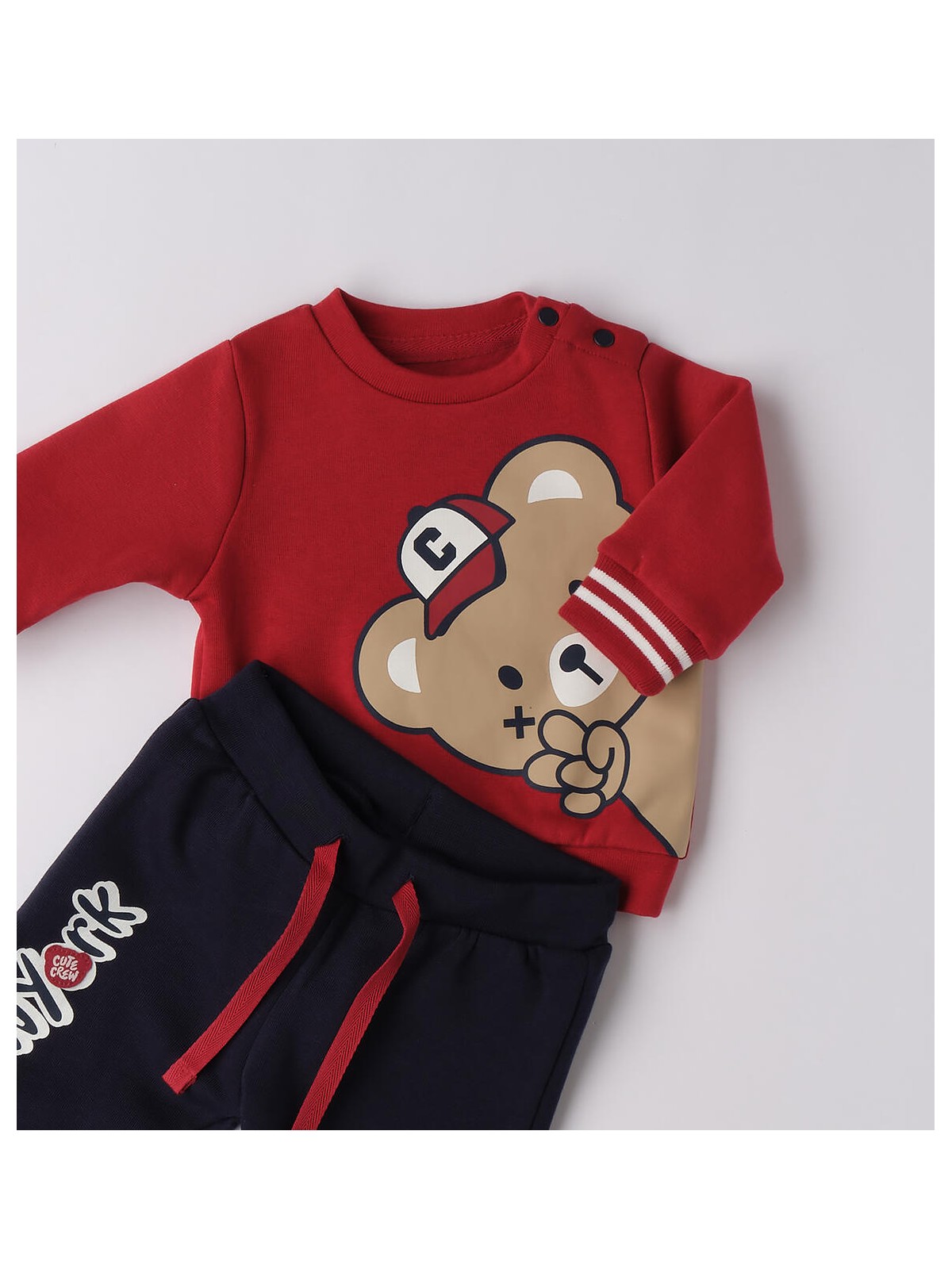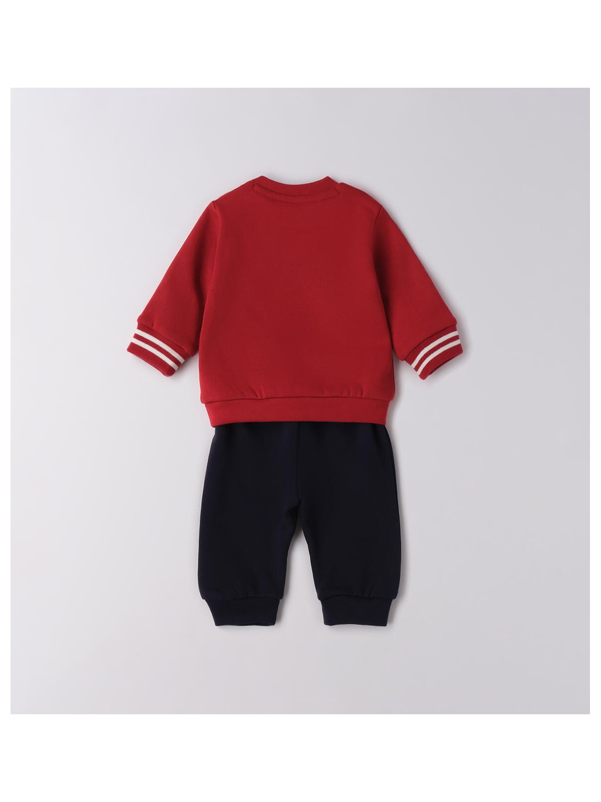 Completo bimbo realizzato in cotone felpato invernale. La felpa ha l'apertura sulla spalla con bottoni a pressione e stampa frontale. I pantaloni hanno vita elasticizzata con coulisse e fantasia tinta unita con stampa.