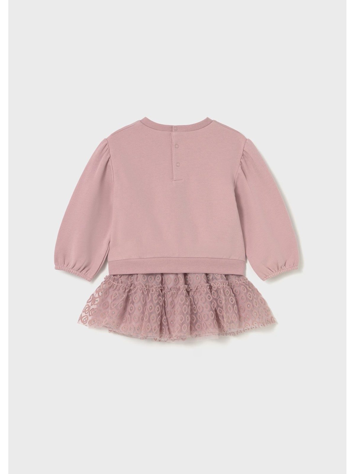 Originale completo per bebé. Felpa casual per bebé. Girocollo. Chiusura con bottoni a pressione nella parte posteriore. Elementi decorativi: applicazione decorativa. Gonna per bebé. Elastico in vita. Confezione in tulle leggero e vaporoso. Modello con riccio e volant.