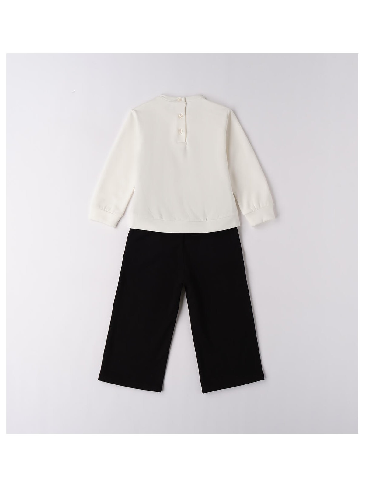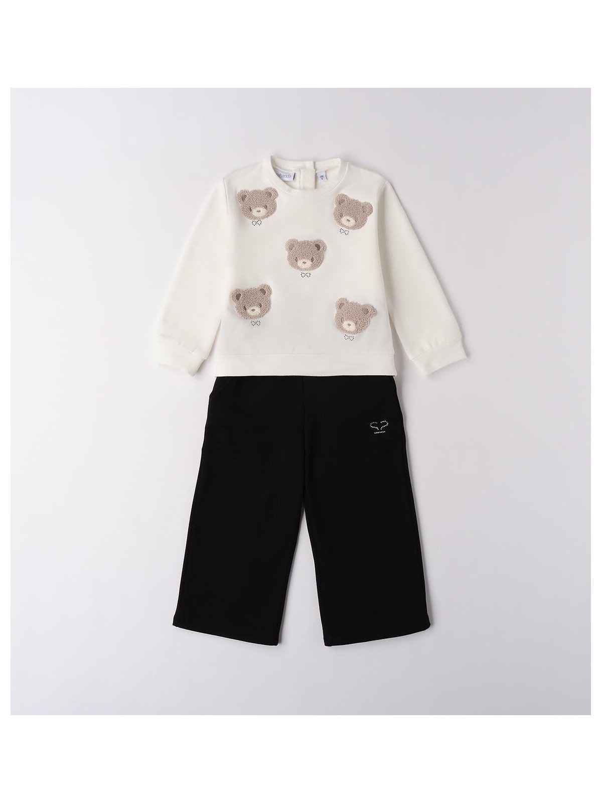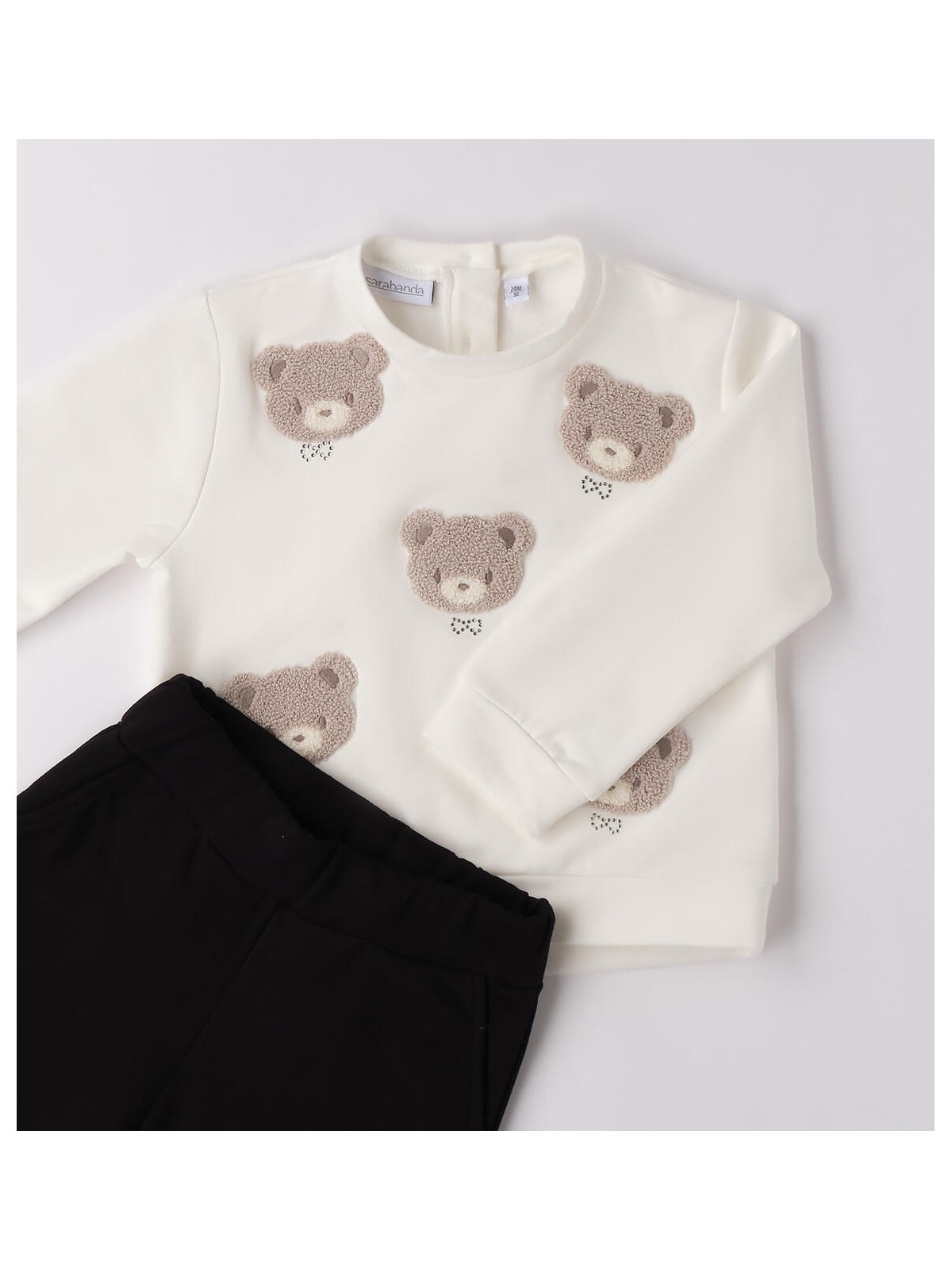 Completo per bambina realizzato in felpa invernale, felpata internamente, cotone stretch. Il modello è composto da felpa e pantalone. La felpa è arricchita da applicazione ricamo spugna e strass. Pantalone con elastico in vita e coulisse