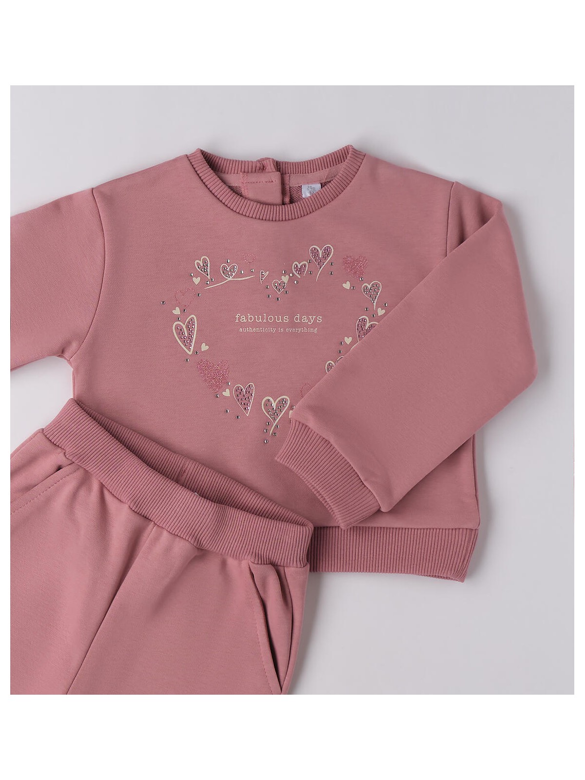 Tuta per bambina in felpa autunnale. La felpa è girocollo con stampa, glitter e strass. Il pantalone ha le tasche ed elastico in vita con coulisse.