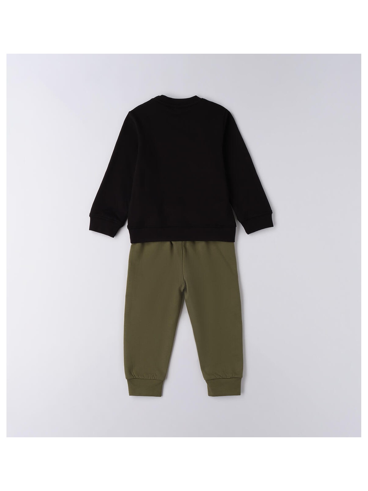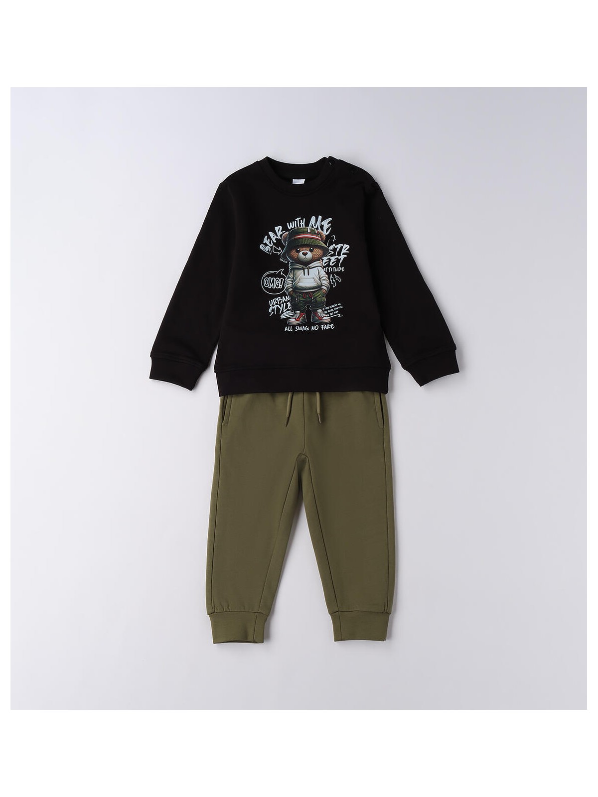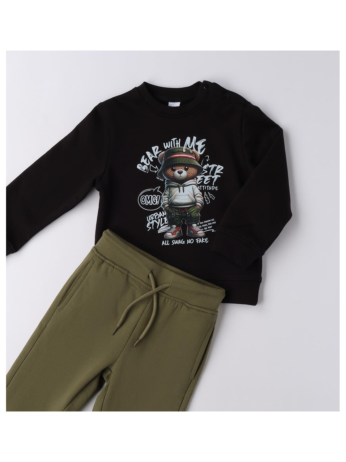 Tuta per bambino in felpa invernale. La felpa è girocollo con stampa orso. Pantaloni con coulisse ed elastico sul fondo. Tasche laterali.