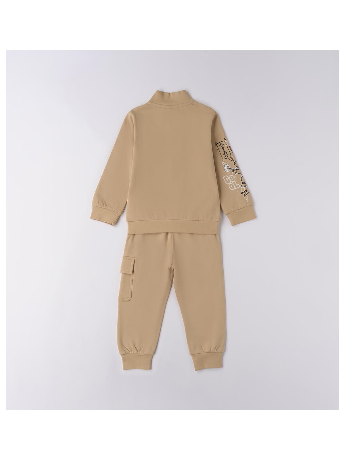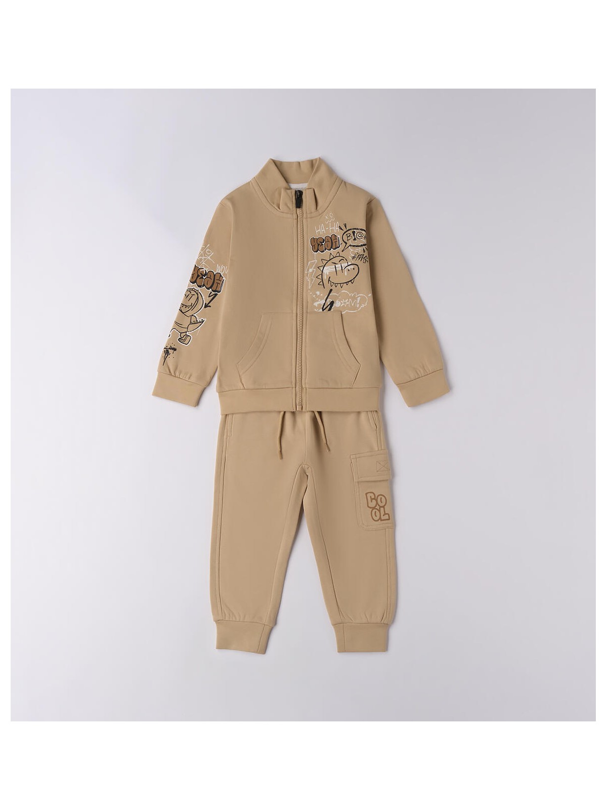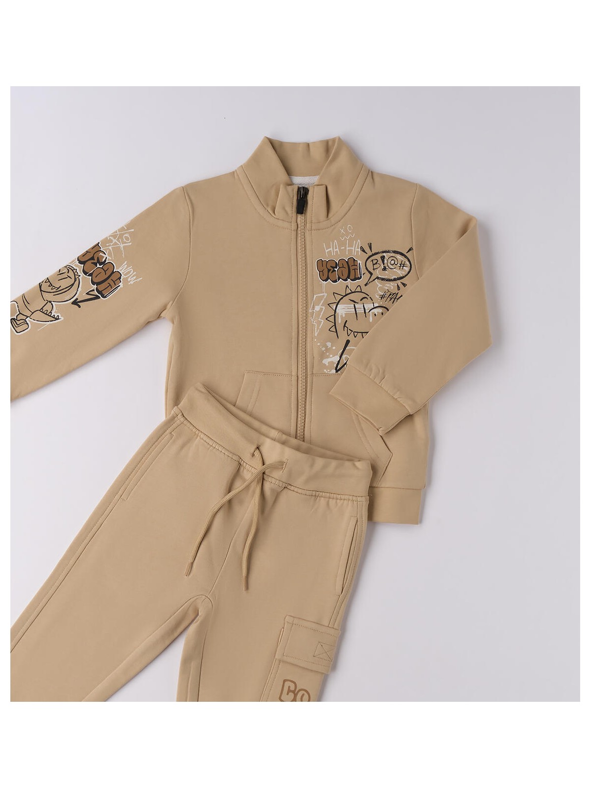 Tuta per bambino in felpa invernale 100% cotone. La felpa presenta apertura con zip, tasche a marsupio e stampe. Il pantalone ha vita elasticizzata con coulisse, polsini sul fondo gamba e tascone laterale.