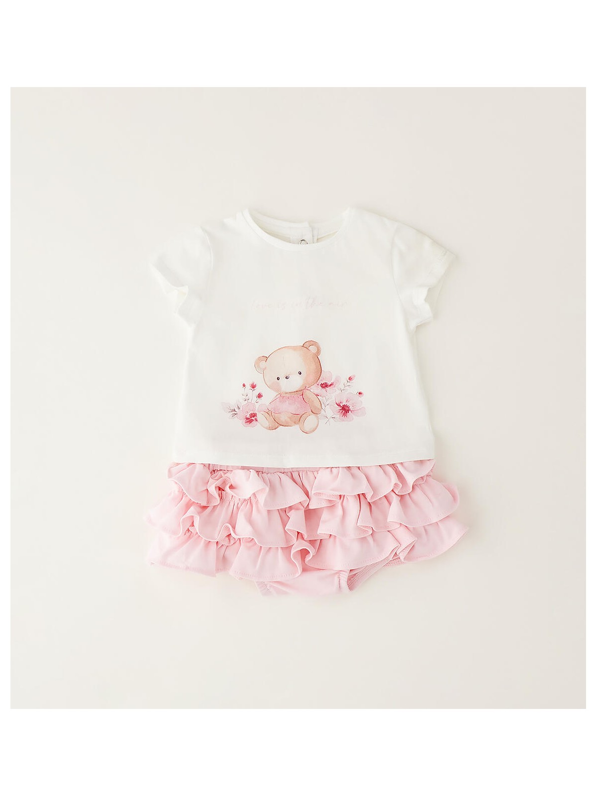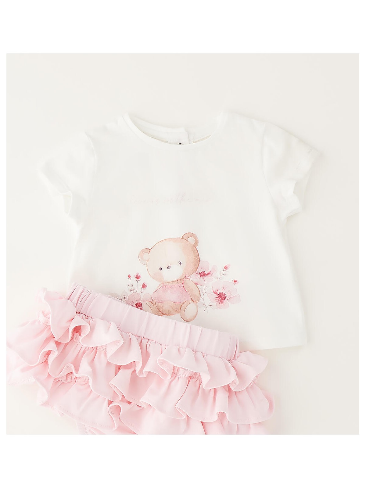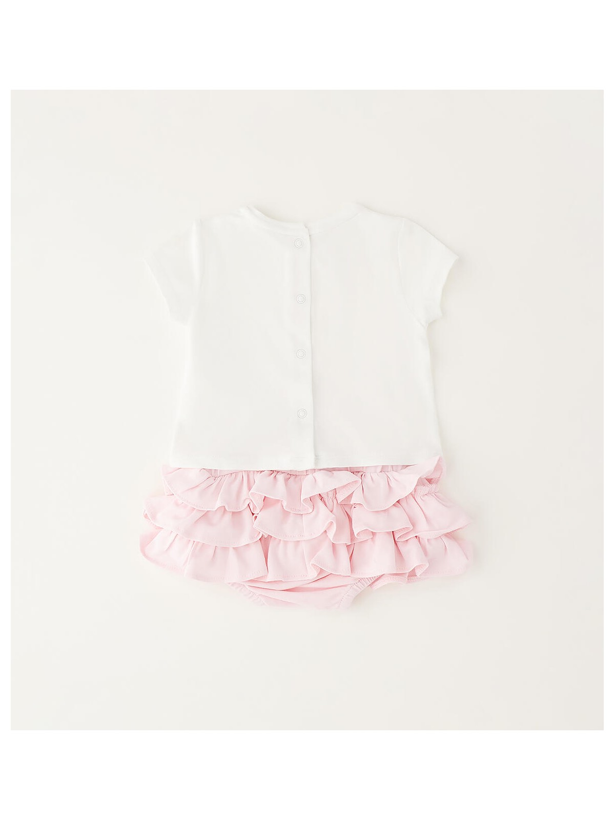 Grazioso completo per bimba in jersey stretch di cotone. La t-shirt ha l'apertura sul retro con bottoni a pressione e dolce stampa davanti. Gonna con mutandina con elastico in vita e ruches.