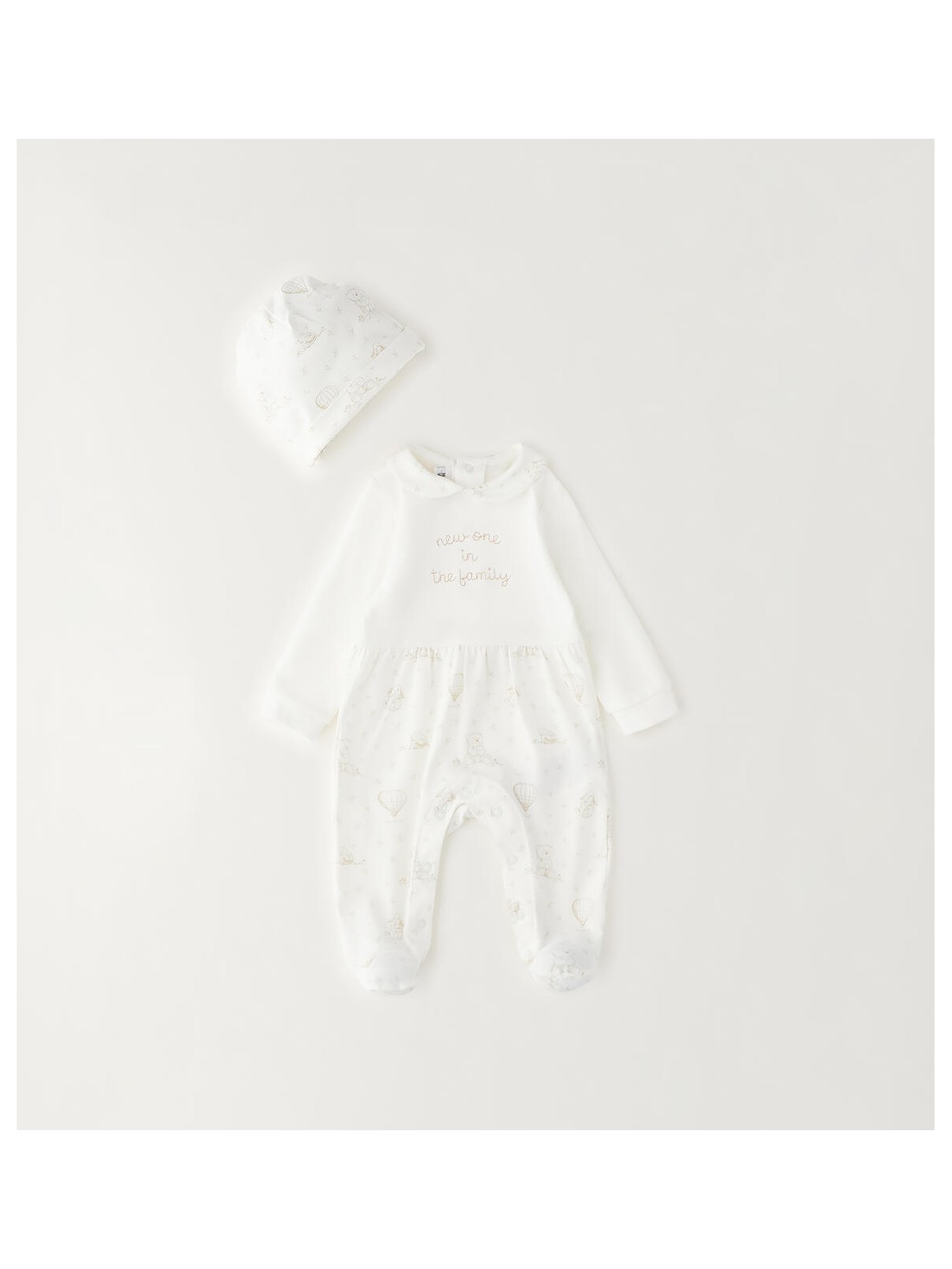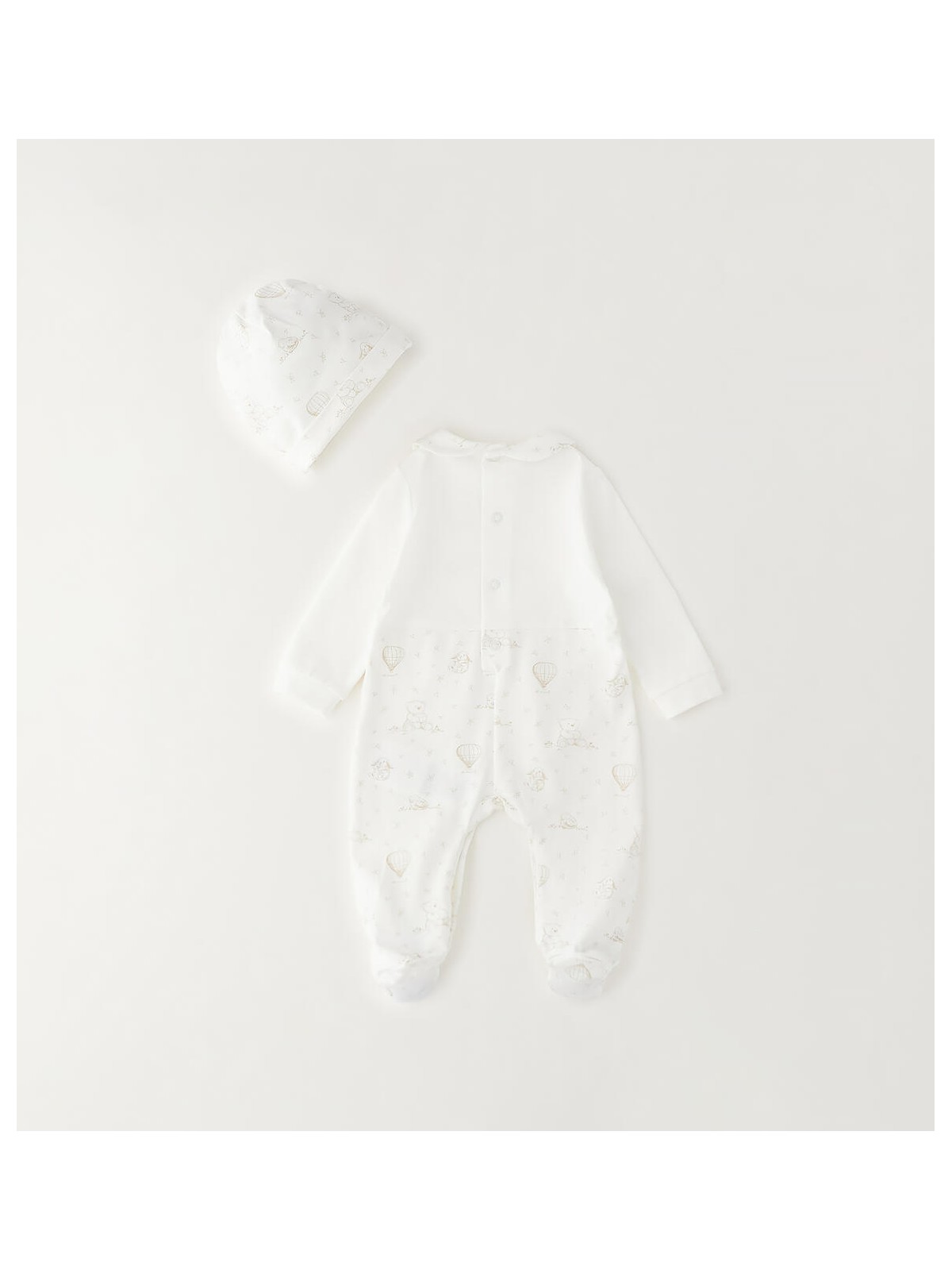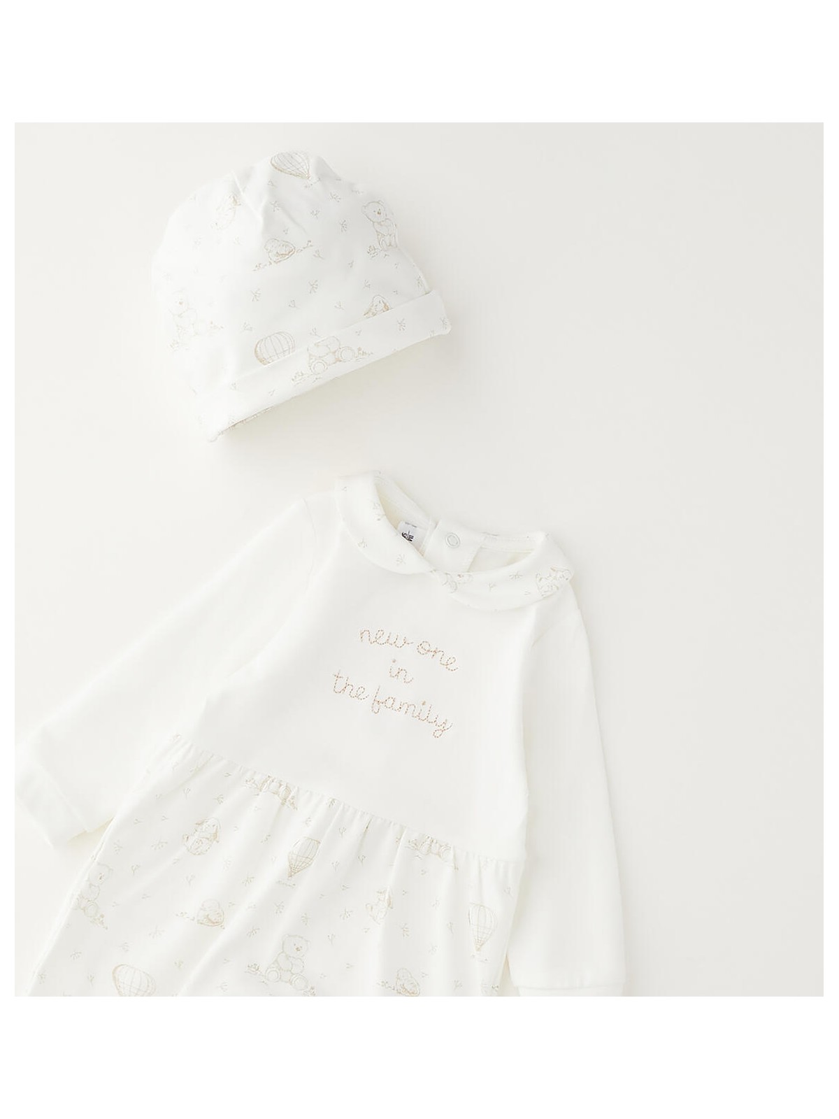 Tutina intera con piede Minibanda per neonati, modello unisex. La tutina è realizzata in jersey stretch di cotone con stampa all over e ricamo davanti. Il modello presenta apertura sul retro e nel sottogamba con bottoni a pressione per agevolare il cambio e la vestizione. Cappellino con stampa all over in abbinamento.