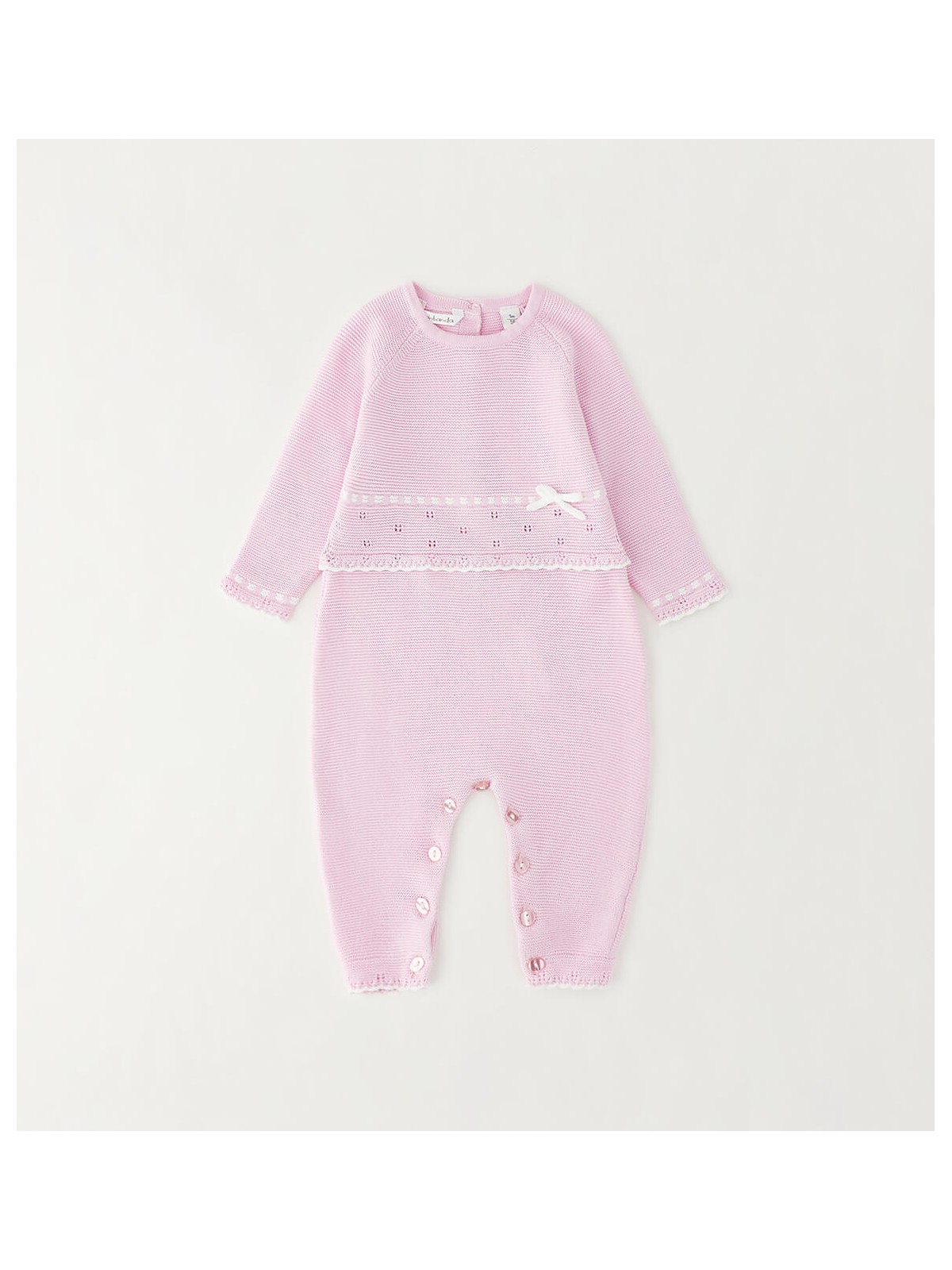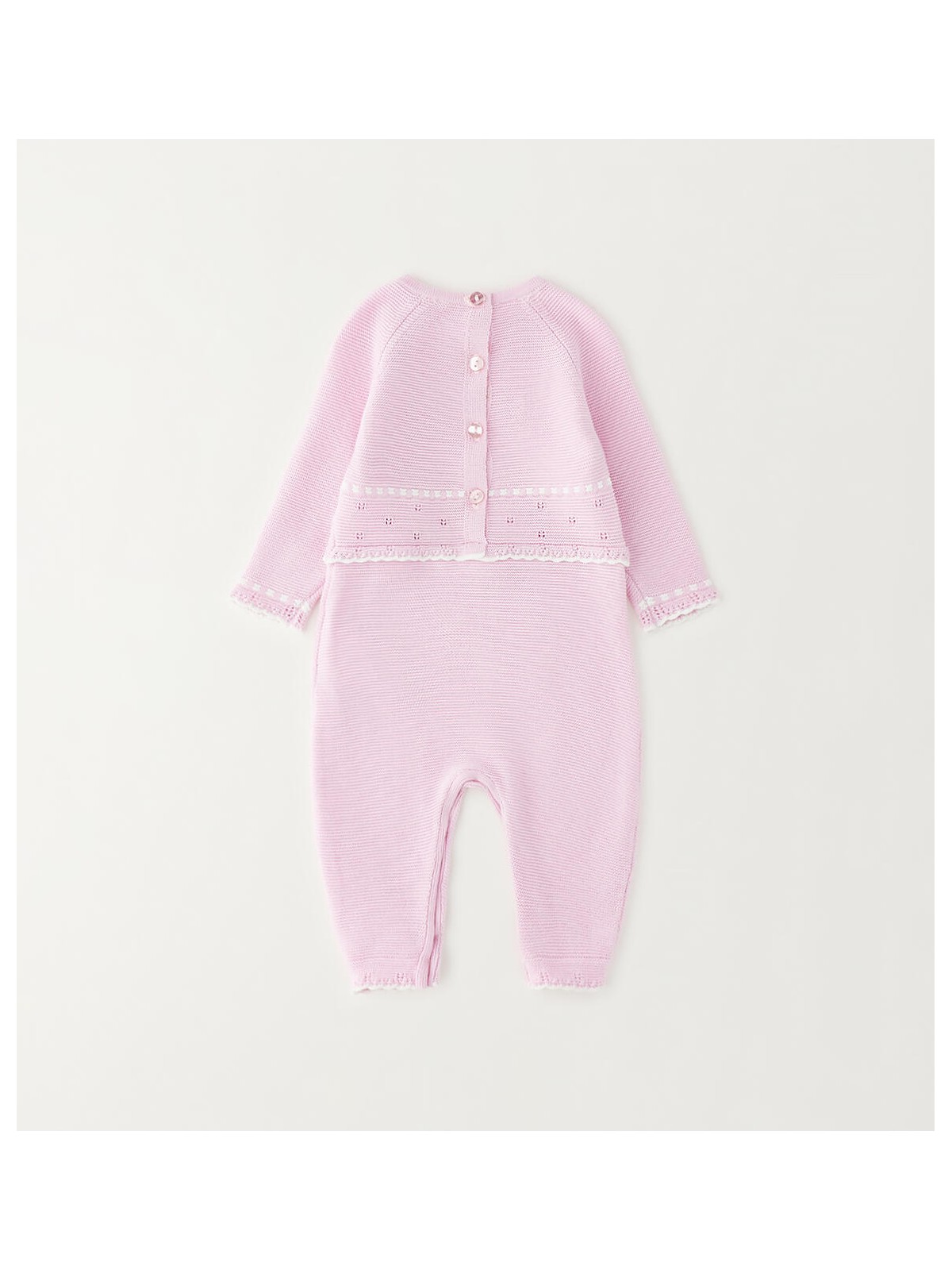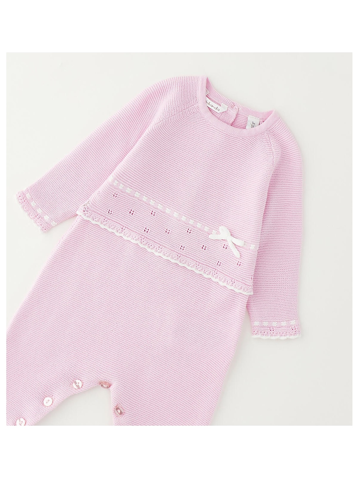 Tutina intera per neonata Minibanda realizzata in tricot 100% cotone. Il modello presenta apertura sul retro e nel sottogamba con bottoni per agevolare il cambio e la vestizione.