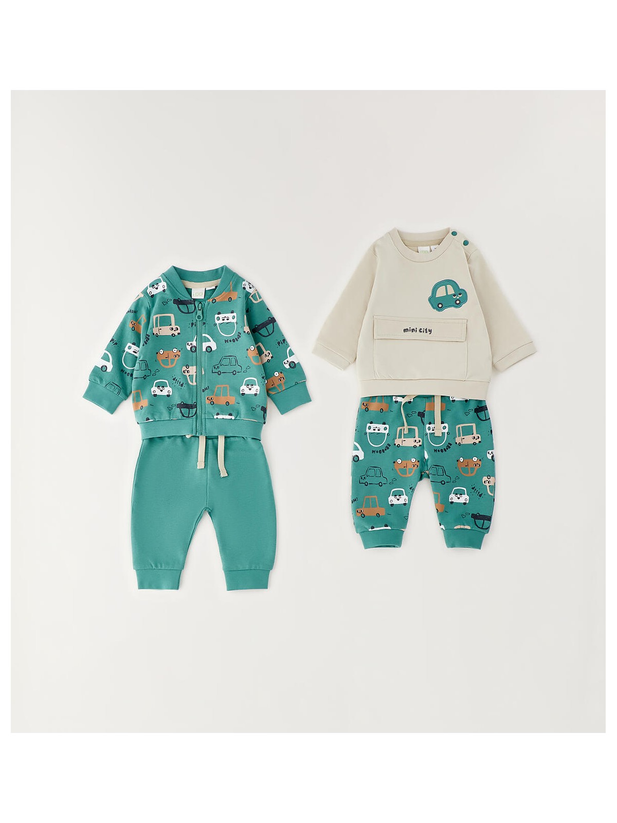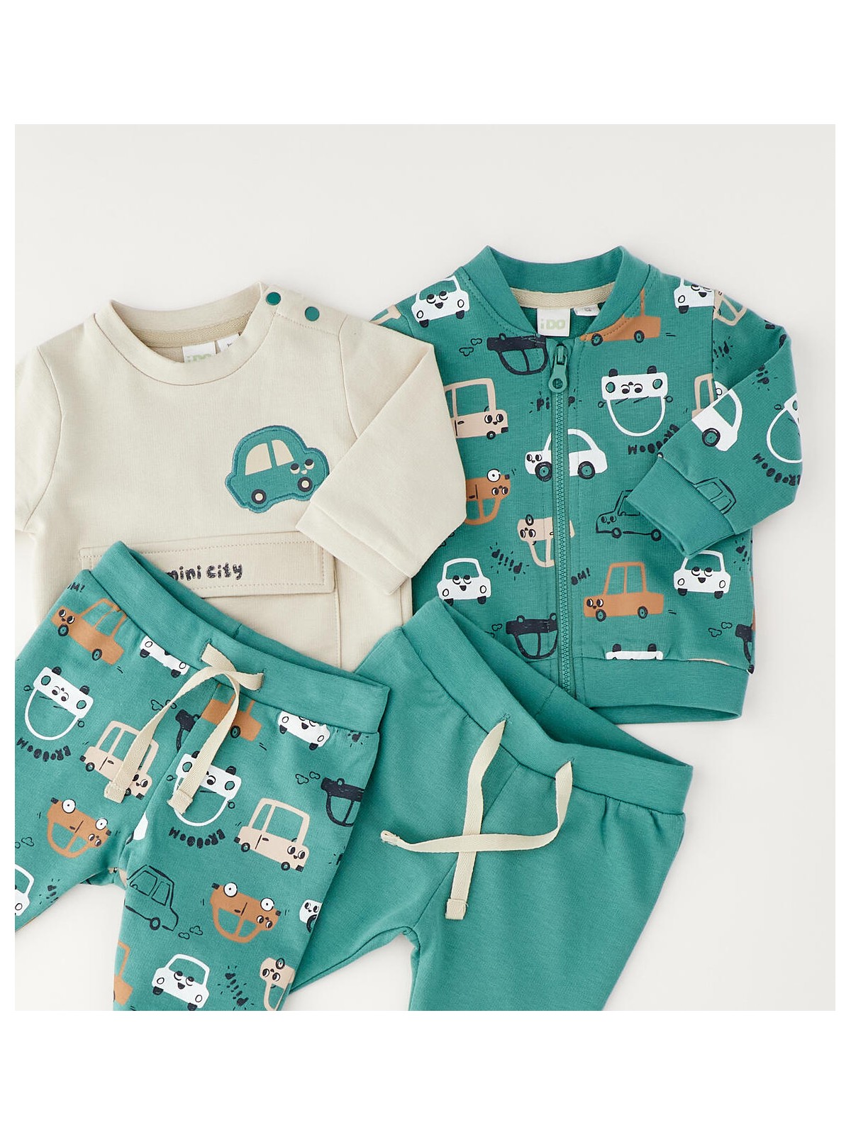Tuta per bimbo realizzata in felpa 100% cotone., due varianti disponibili. Un modello è girocollo con tasca davanti, applicazione ricamo e apertura sulla spalla con bottoni a pressione. Pantalone con elastico in vita e fantasia all over. L'altro modello ha la felpa con apertura tramite zip e fantasia all over. Pantalone con elastico in vita e coulisse.