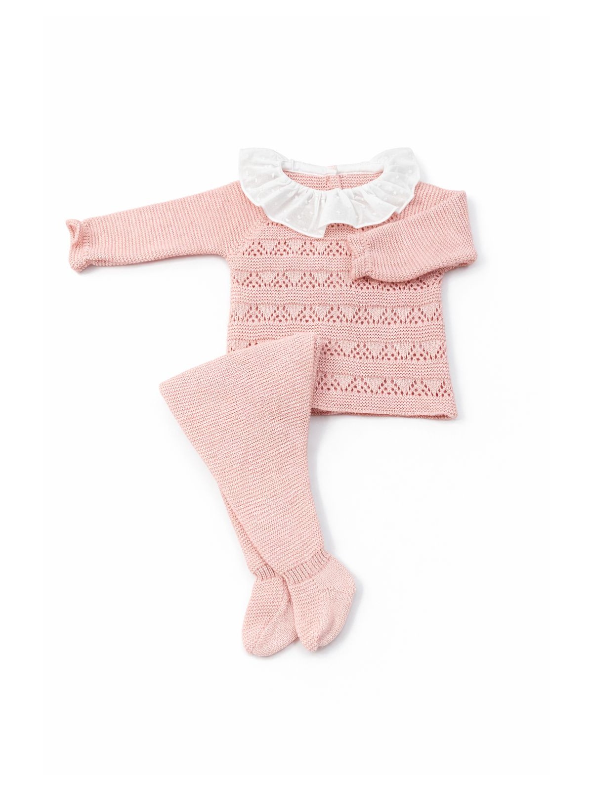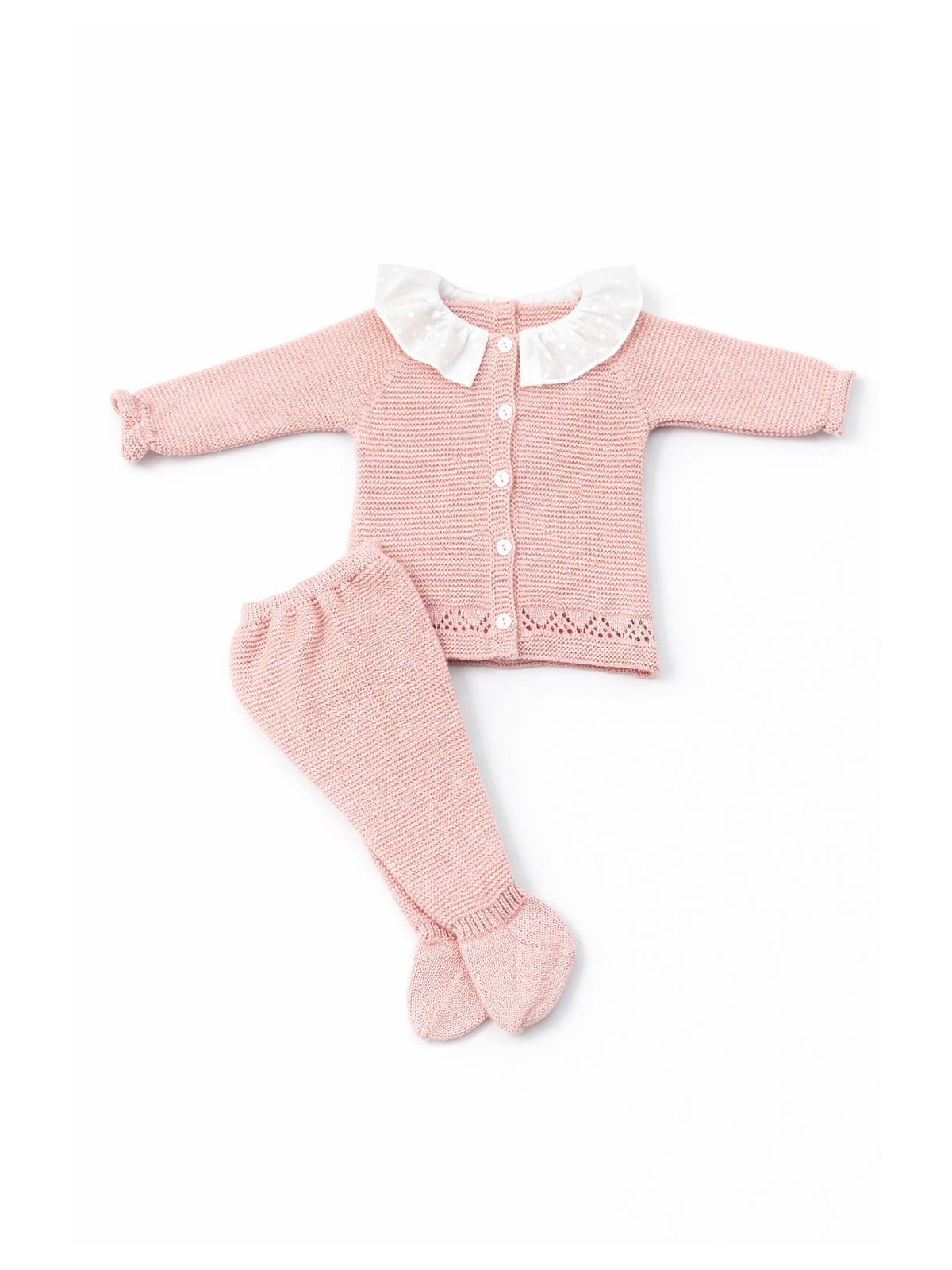 Set primavera/estate costituito da 2 pezzi - Coprifasce con delicata lavorazione traforata e colletto. Comoda apertura sul retro con bottoncini - Ghettina tinta unita con piedini .