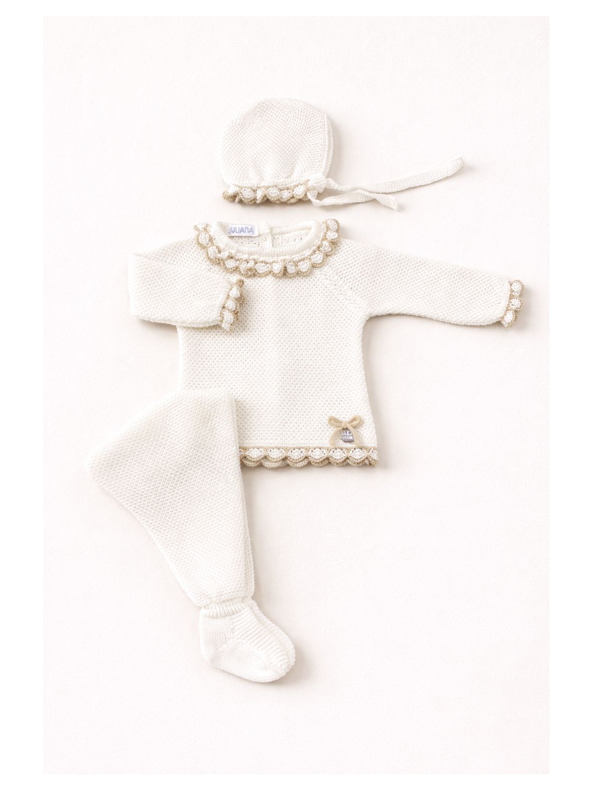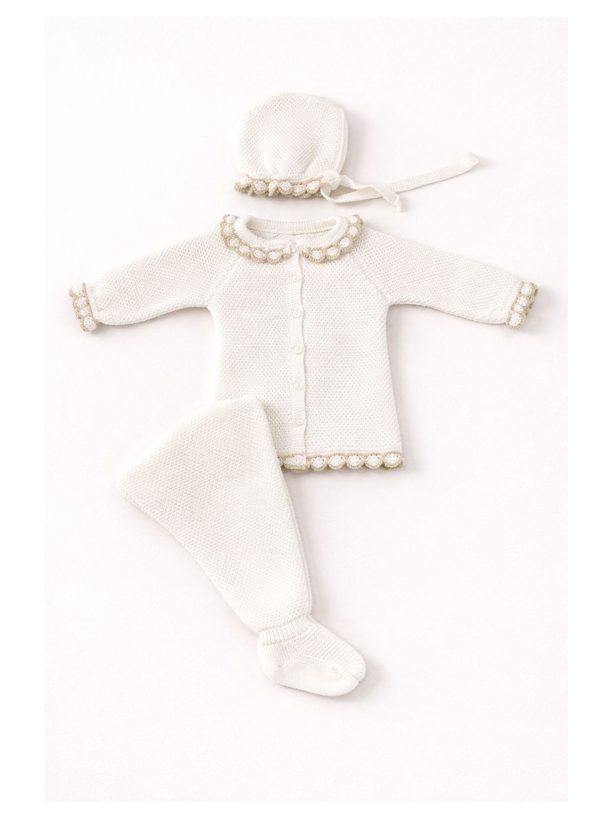 Set costituito da 3 pezzi - Coprifasce con delicata lavorazione e piccolo colletto di merletto - Grazioso fiocchetto applicato - Comoda apertura sul retro con bottoncini - Ghettina tinta unita - Cuffietta con bordino beige e delicato volants con laccetti