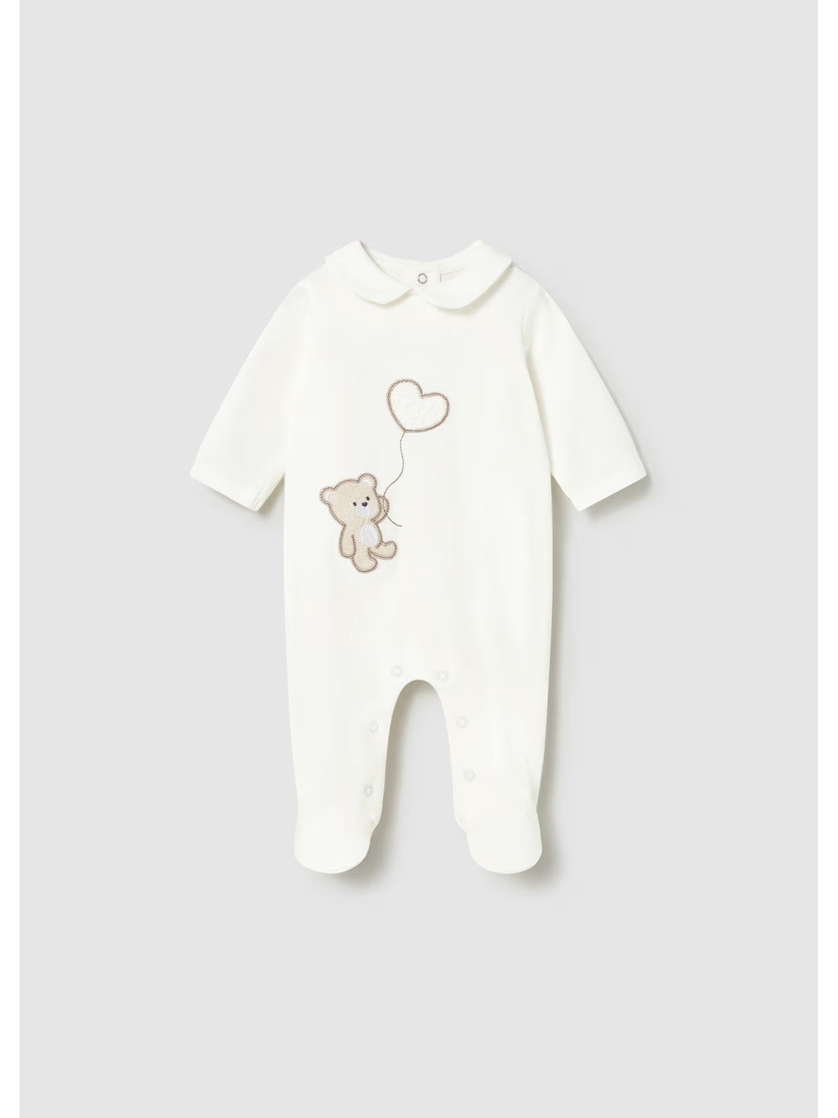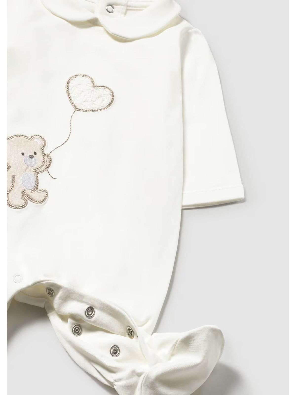 Tutina intera con piede per neonata in cotone. Il modello presenta apertura sul retro e nel sottogamba con bottoni a pressione per agevolare il cambio e la vestizione. Applicazioni sul davanti orsetto e cuore