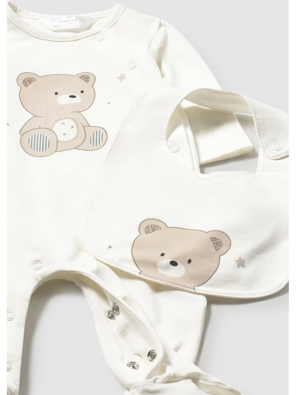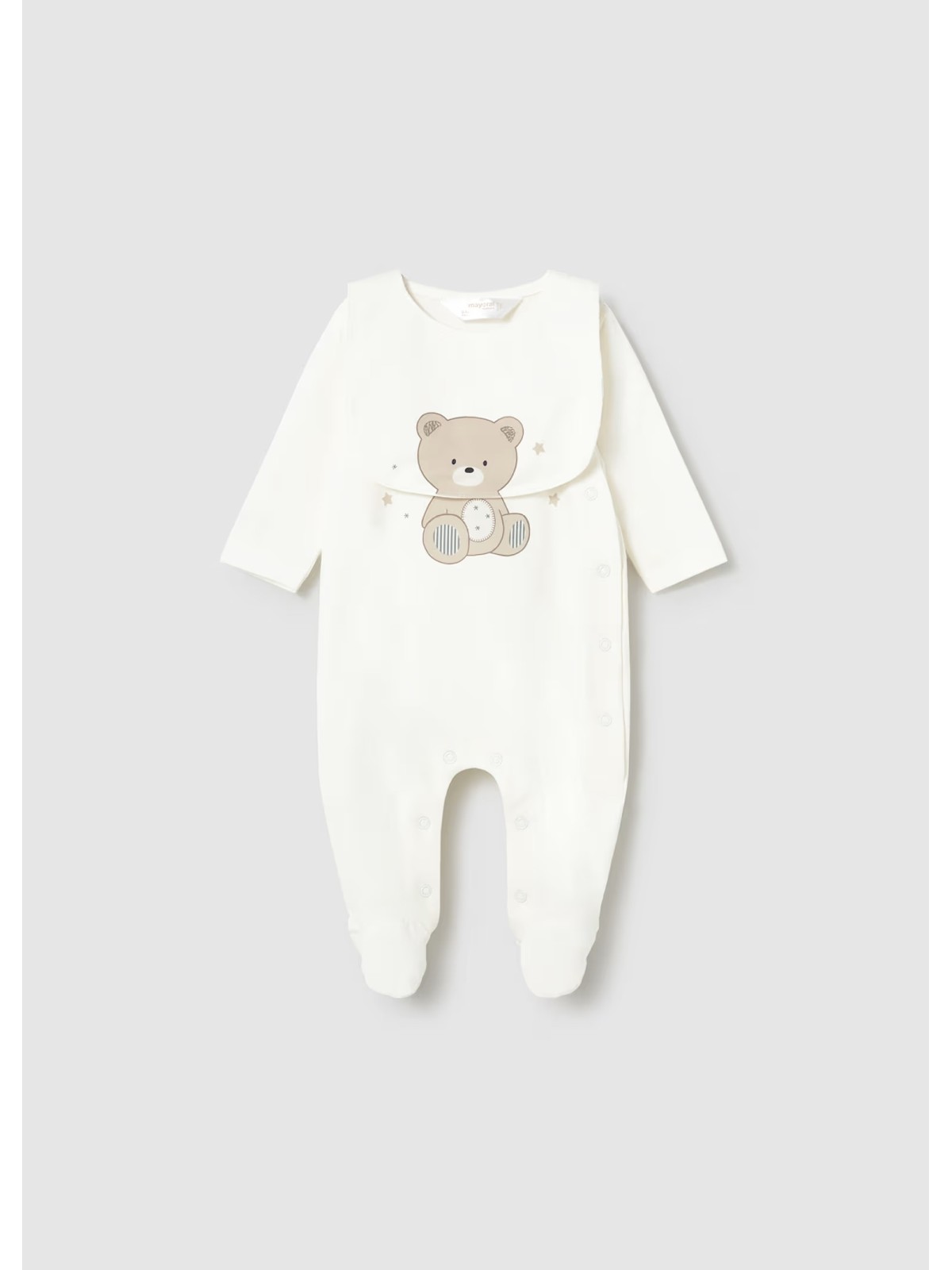 Tutina intera con piede realizzata in jersey stretch di cotone con stampa . Il modello presenta apertura sul retro e nel sottogamba con bottoni a pressione per agevolare il cambio e la vestizione. Bavetta con stampa in abbinamento.