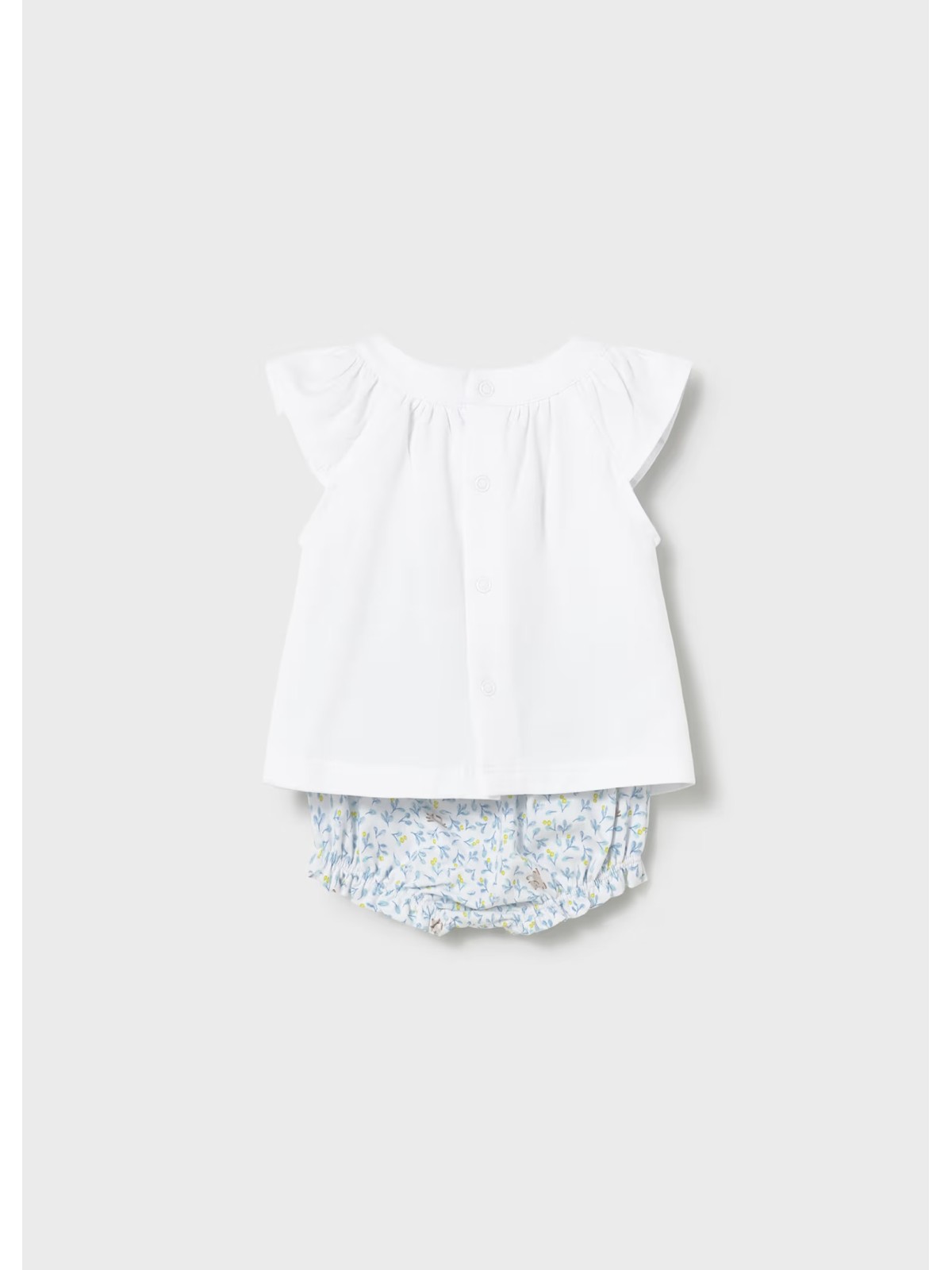 Completo bimba realizzato in cotone stretch. La maglietta è realizzata in jersey stretch di cotone e ha l'apertura sulla spalla con bottoni a pressione. I pantaloni hanno vita elasticizzata. Due varianti disponibili