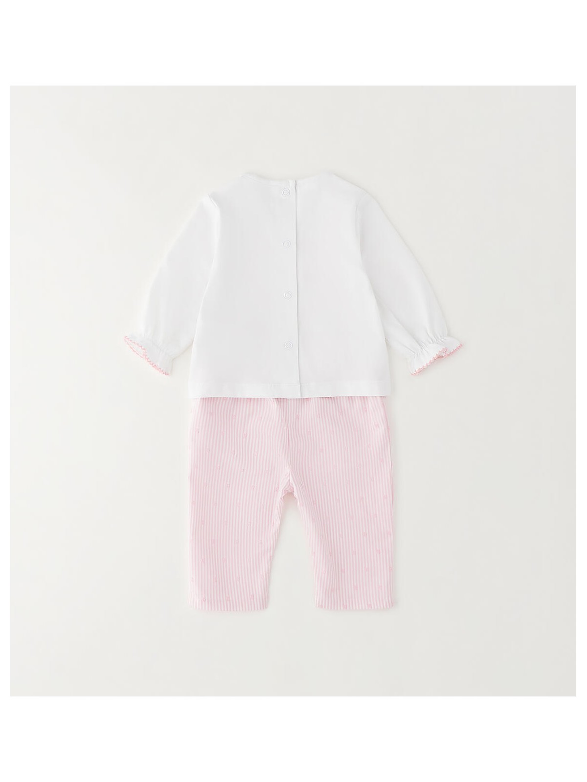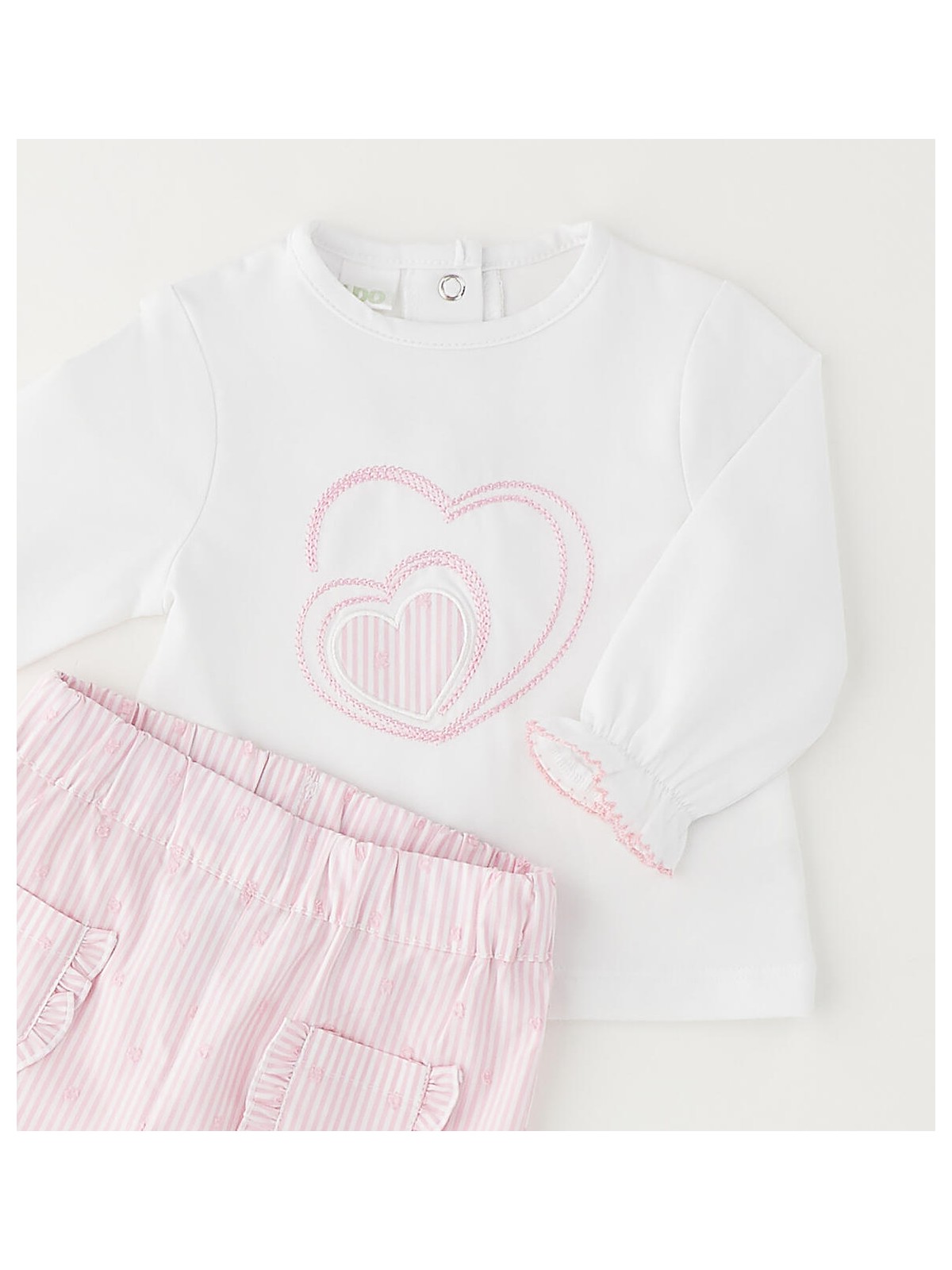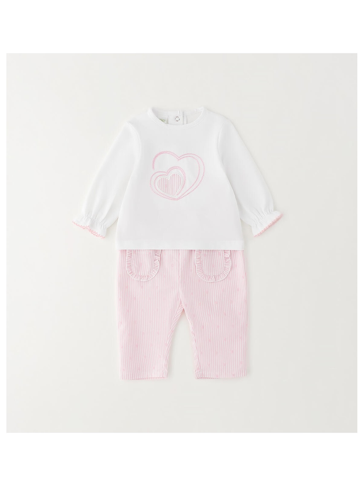 Grazioso completo per bimba realizzato in cotone. La maglietta è in jersey stretch con manica arricciata sul fondo e apertura sul retro con bottoni a pressione. Davanti è impreziosita da ricamo cuori. Pantaloni in popeline stretch dalla fantasia rigata con piccoli ricami e taschini davanti.