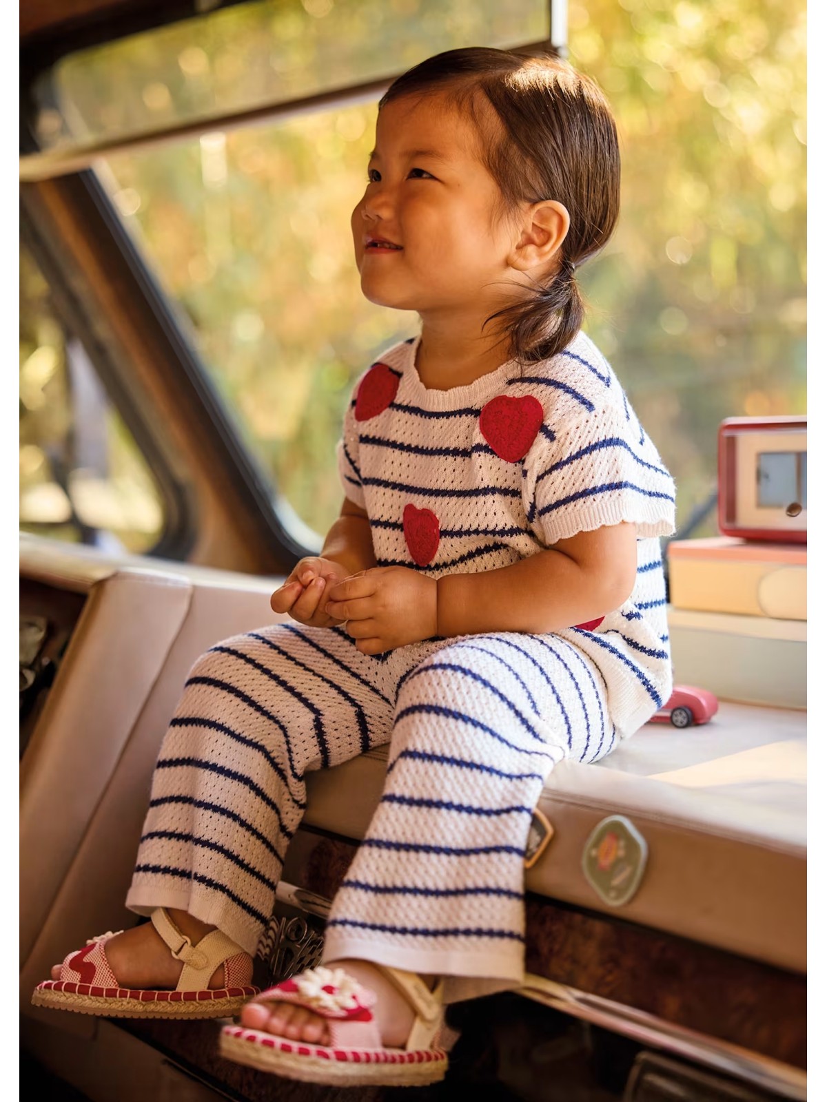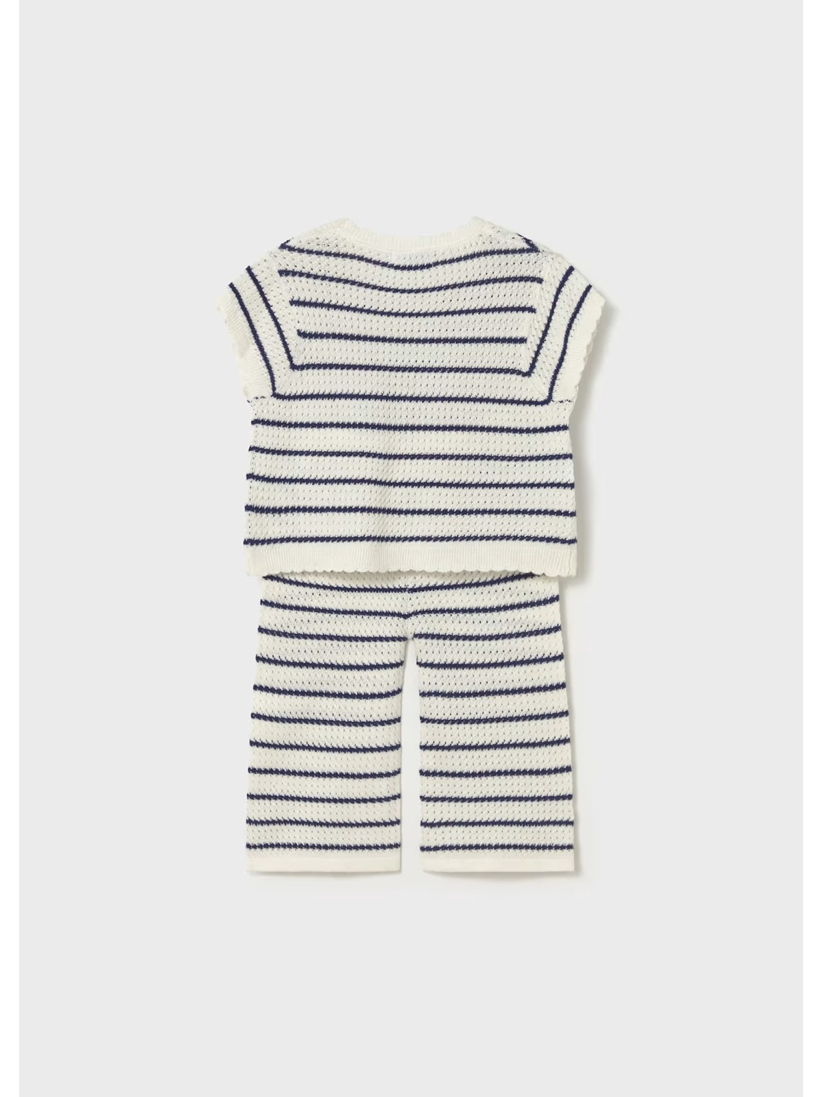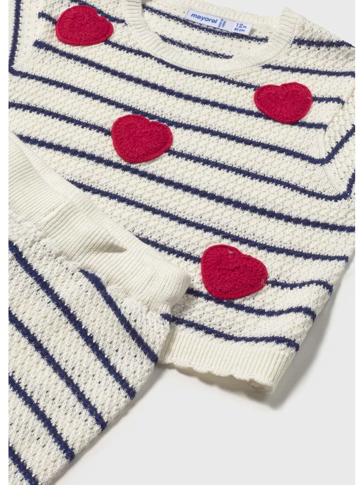 Completo per neonata costituito da maglia e pantalone abbinati. Tessuto in tricot morbido al tatto. Maglia mezza manica trama a righe e applicazione cuori .Pantalone comodo con elastico in vita.