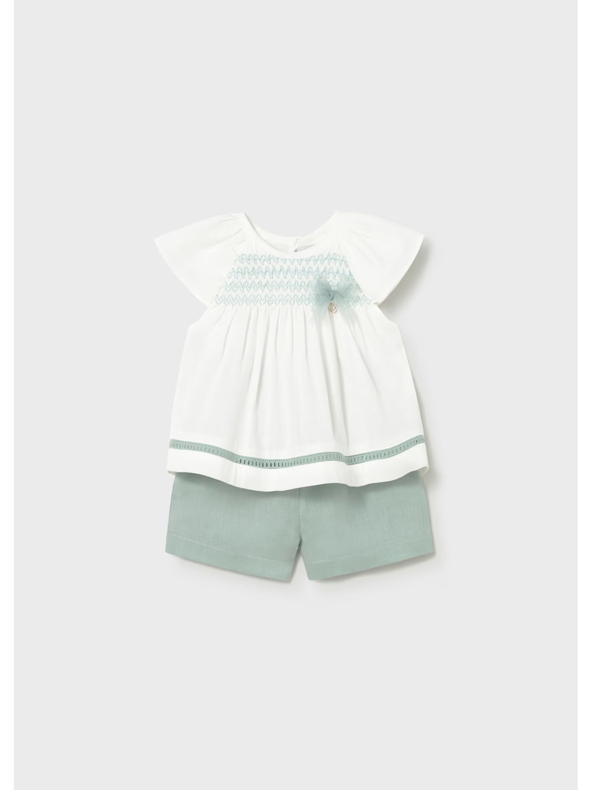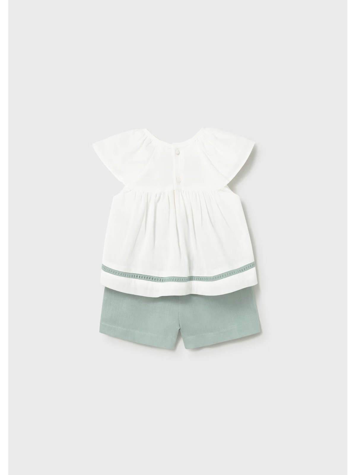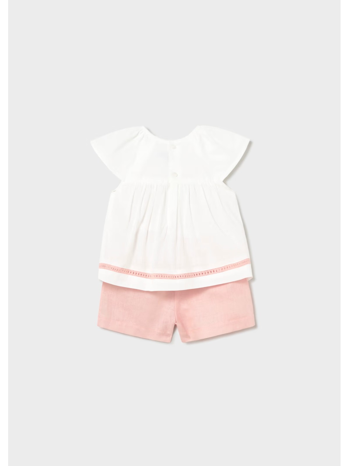 Completo 2 pezzi neonata , composta da blusa e shorts. Blusa modello svasato con applicazione frontale. Shorts tinta unita con elstico in vita