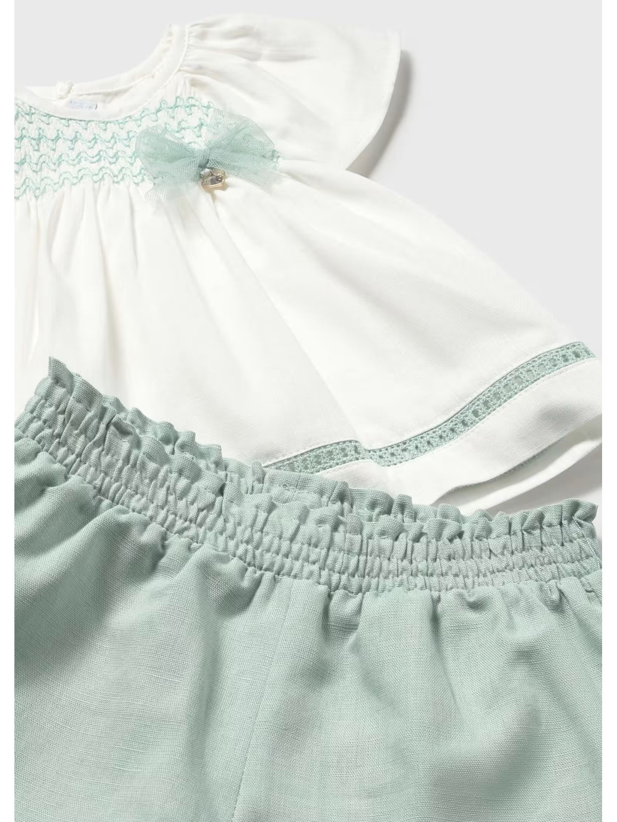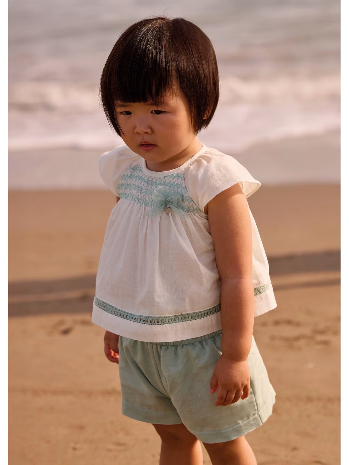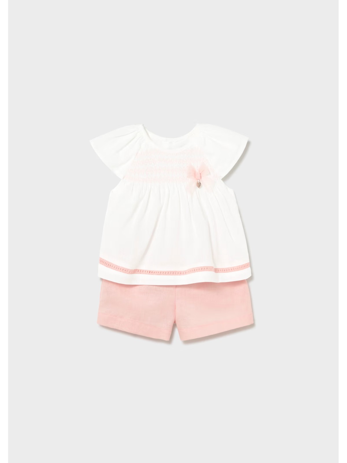 Completo 2 pezzi neonata , composta da blusa e shorts. Blusa modello svasato con applicazione frontale. Shorts tinta unita con elstico in vita