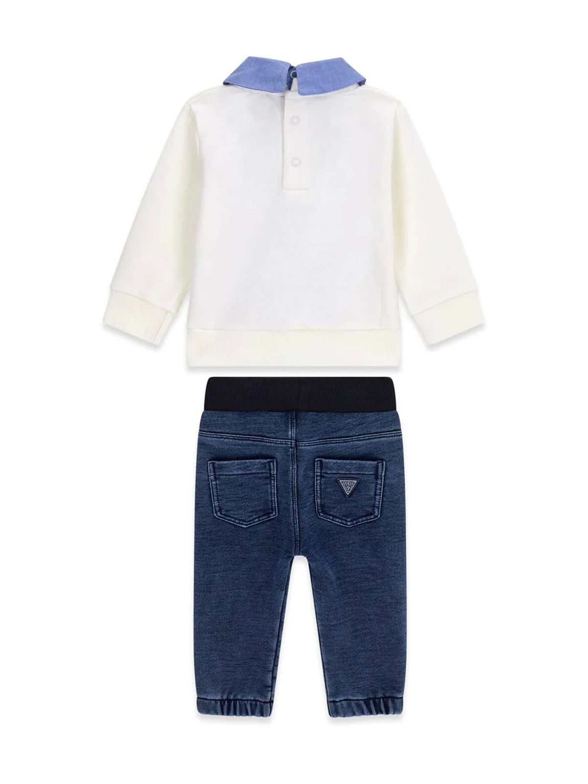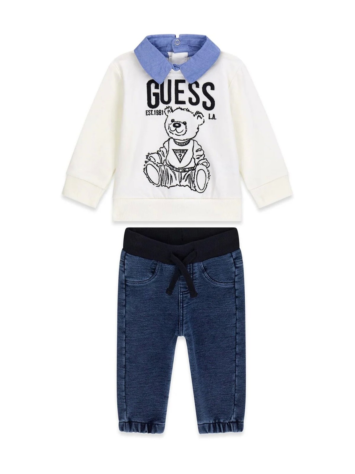 Completo per bambino 2 pezzi felpa e jeans in 100% cotone La felpa porta finto colletto , orsetto e logo frontale. Il jeans ha vita elasticizzata con coulisse, e polsini sul fondo.