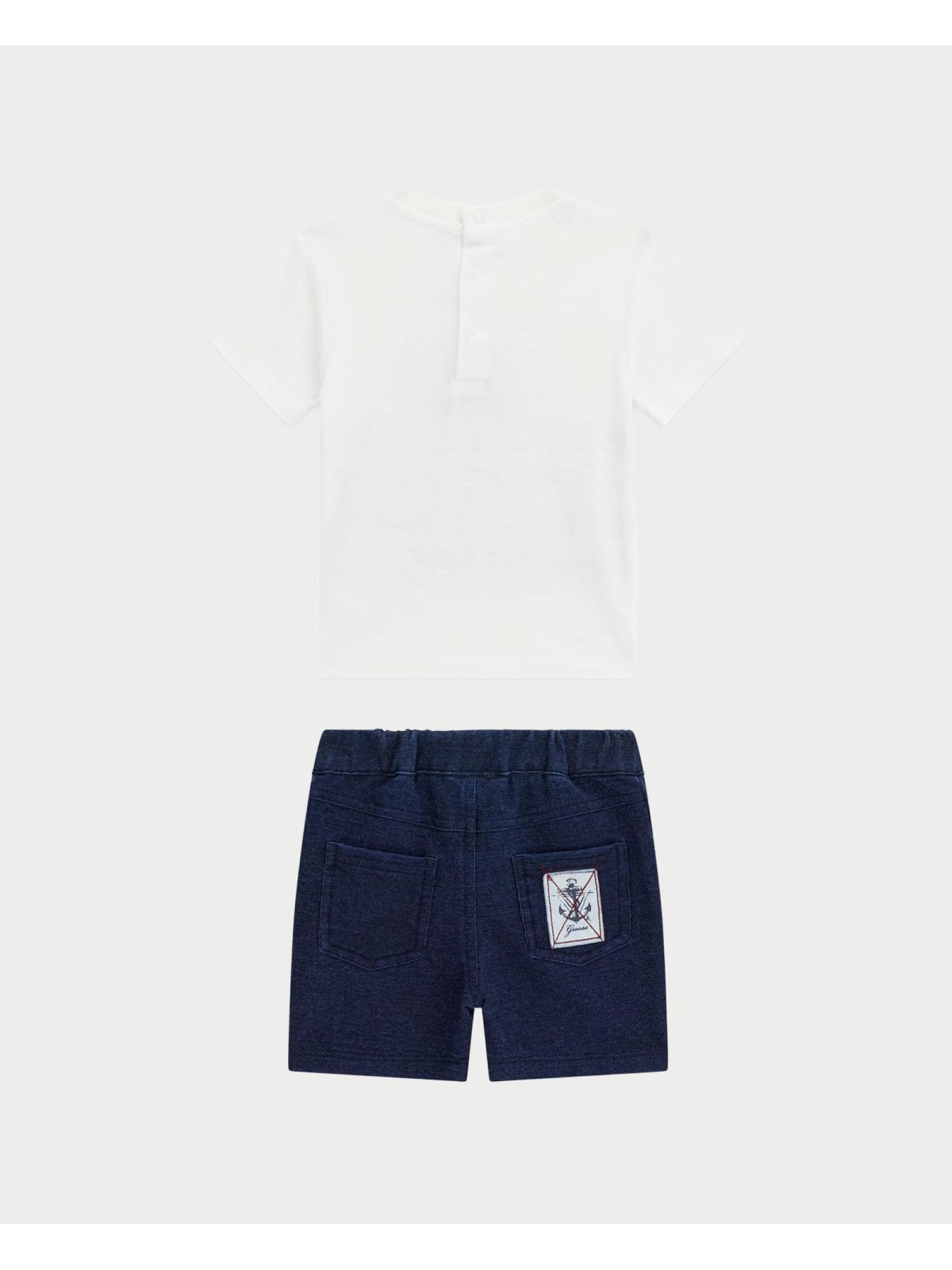 Completo 2 pezzi composto da t-shirt in cotone girocollo con stampa frontale ,morbido jeans corto , vita elastica..