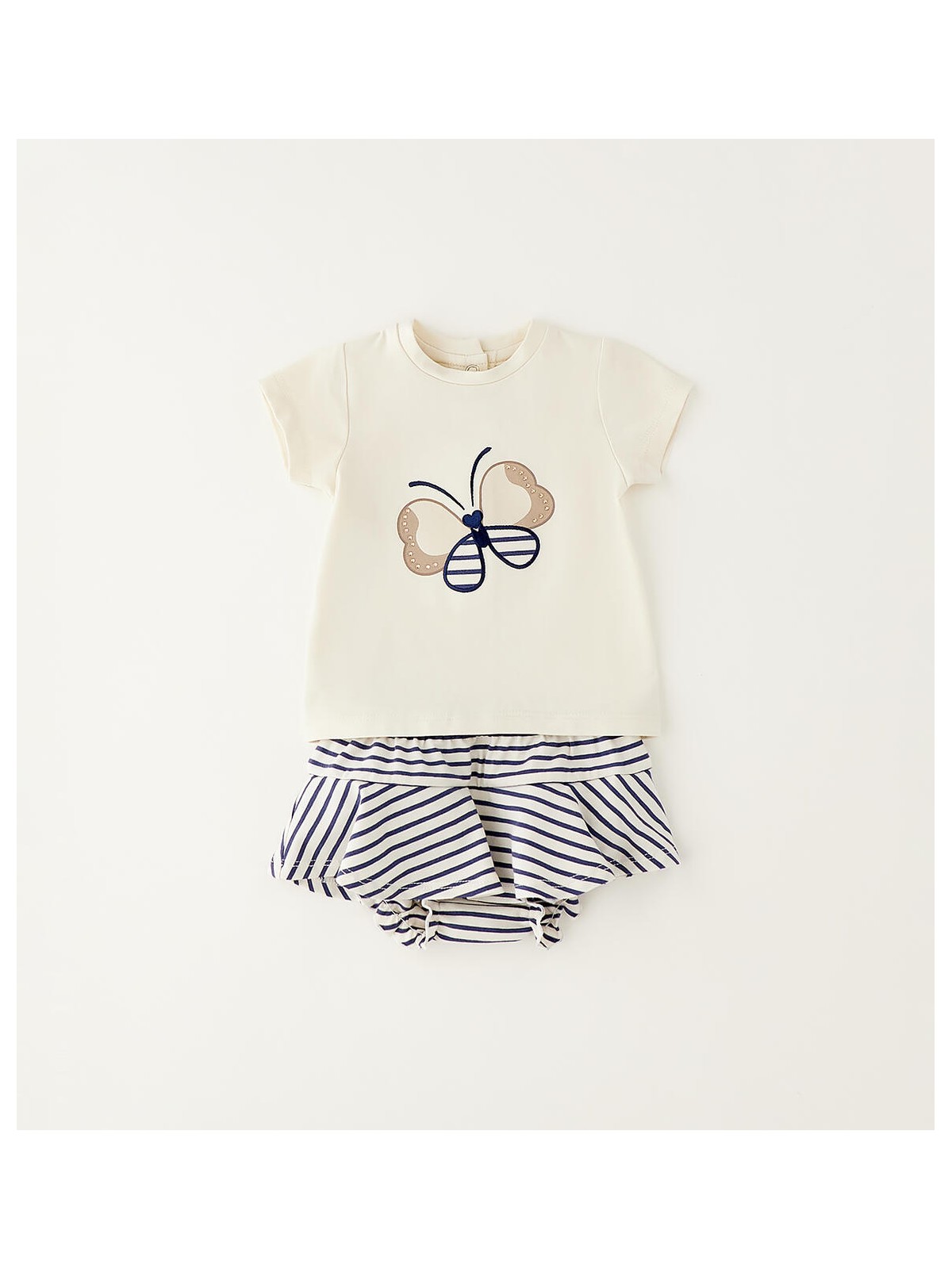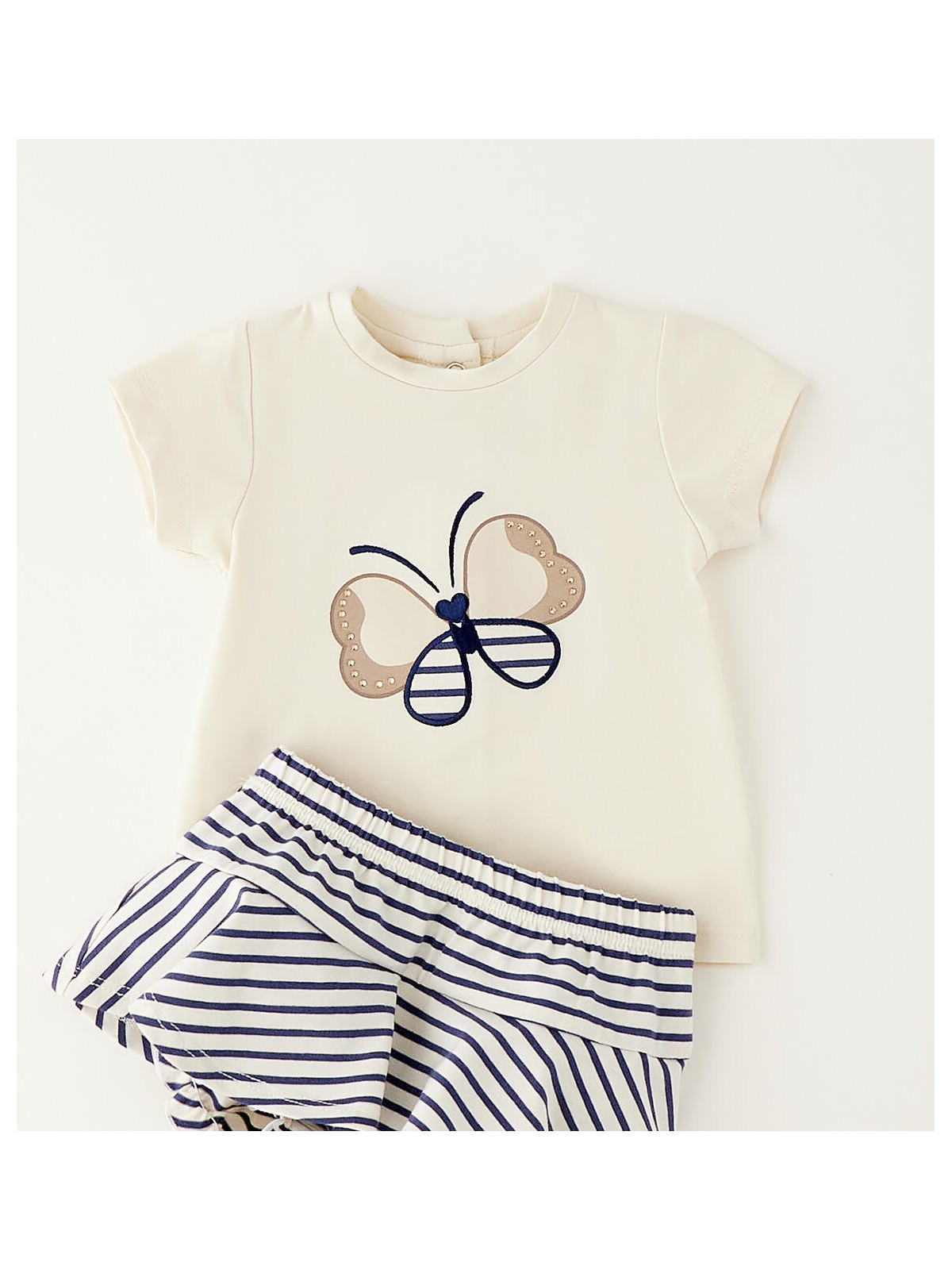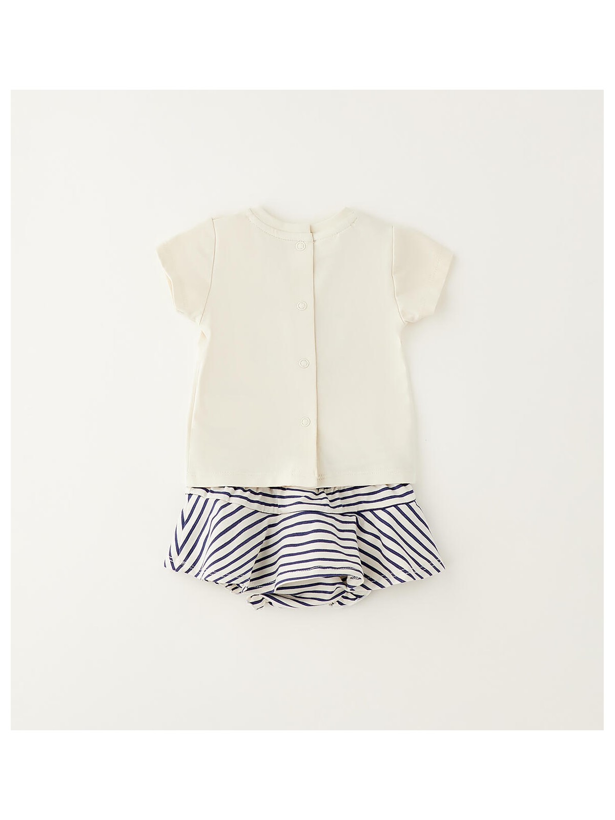 Completo bimba realizzato in jersey stretch di cotone. T-shirt con apertura sul retro con bottoni a pressione. Davanti è arricchita da stampa, ricamo e strass. Gonna con mutandina, fantasia a righe ed elastico in vita.