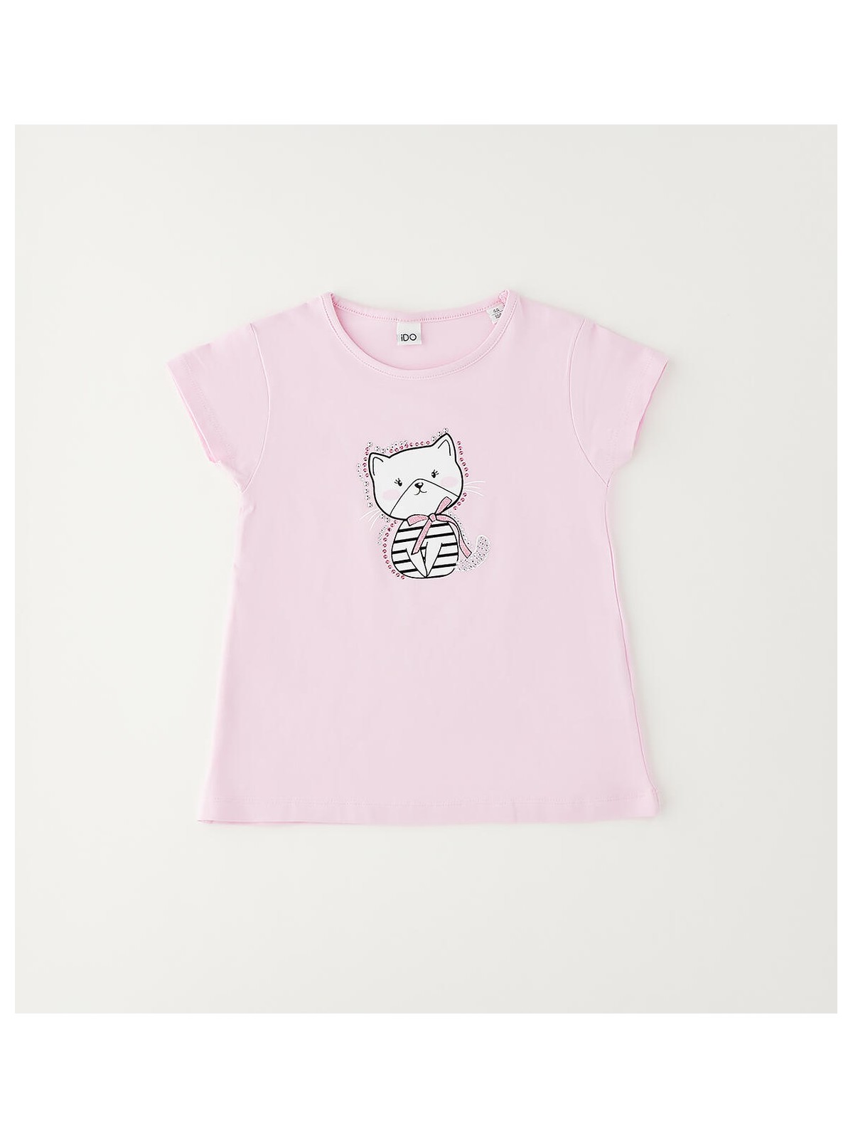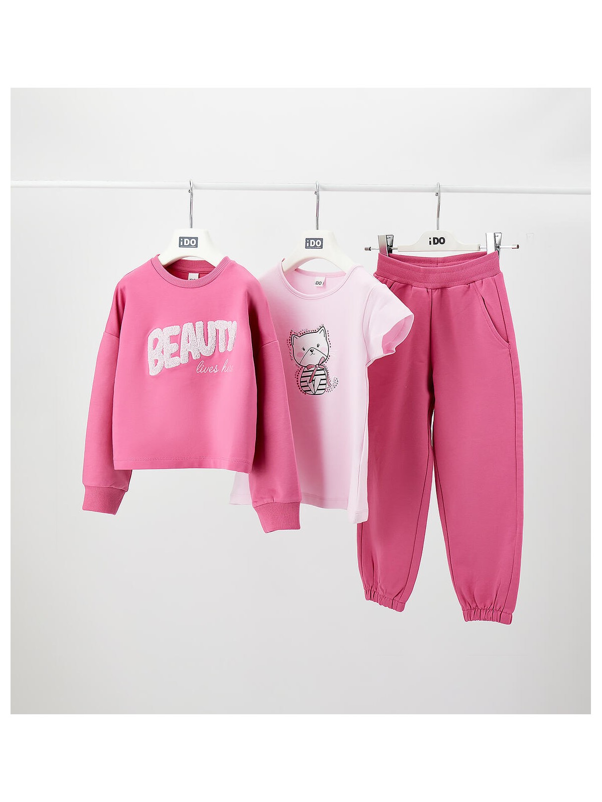 Completo tre pezzi per bambina iDO in cotone stretch. Il completo è composto da tuta e t-shirt. La felpa è realizzata in french terry con stampa glitter e ricamo spugna. T-shirt in jersey stretch con stampa gattino e strass. Pantalone in felpa con elastico in vita e coulisse. Elastico sul fondo gamba.