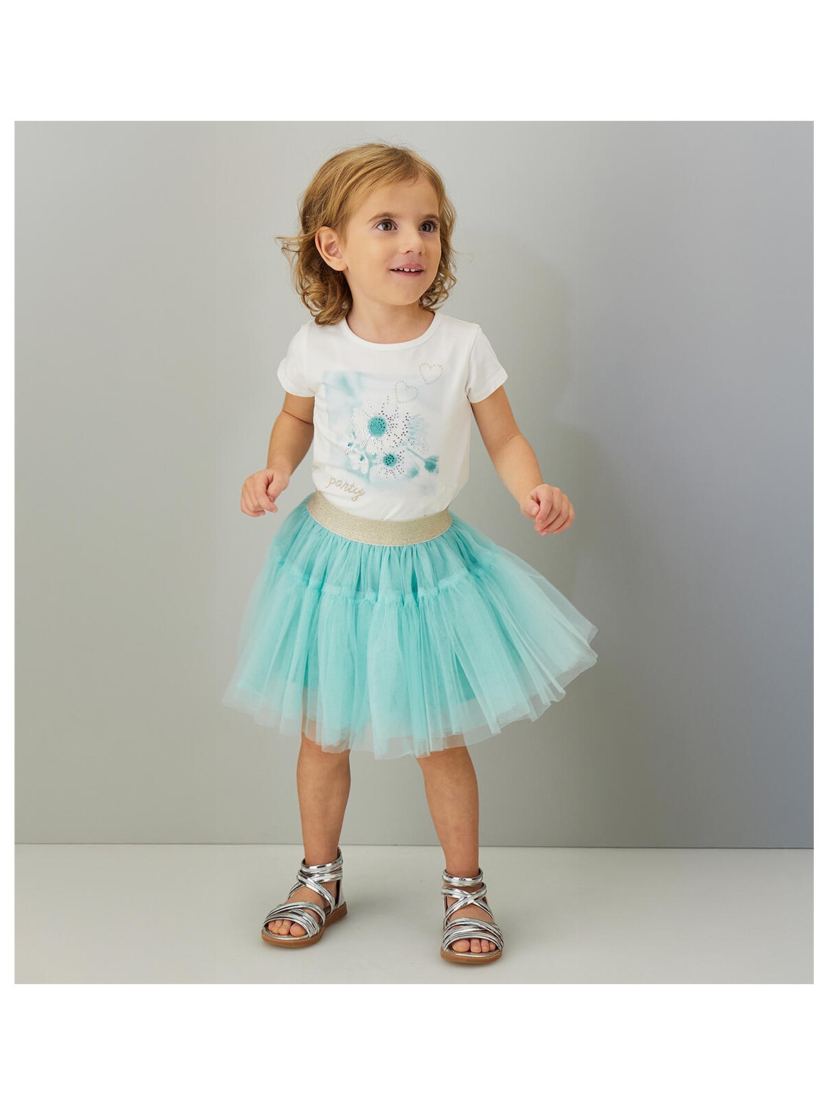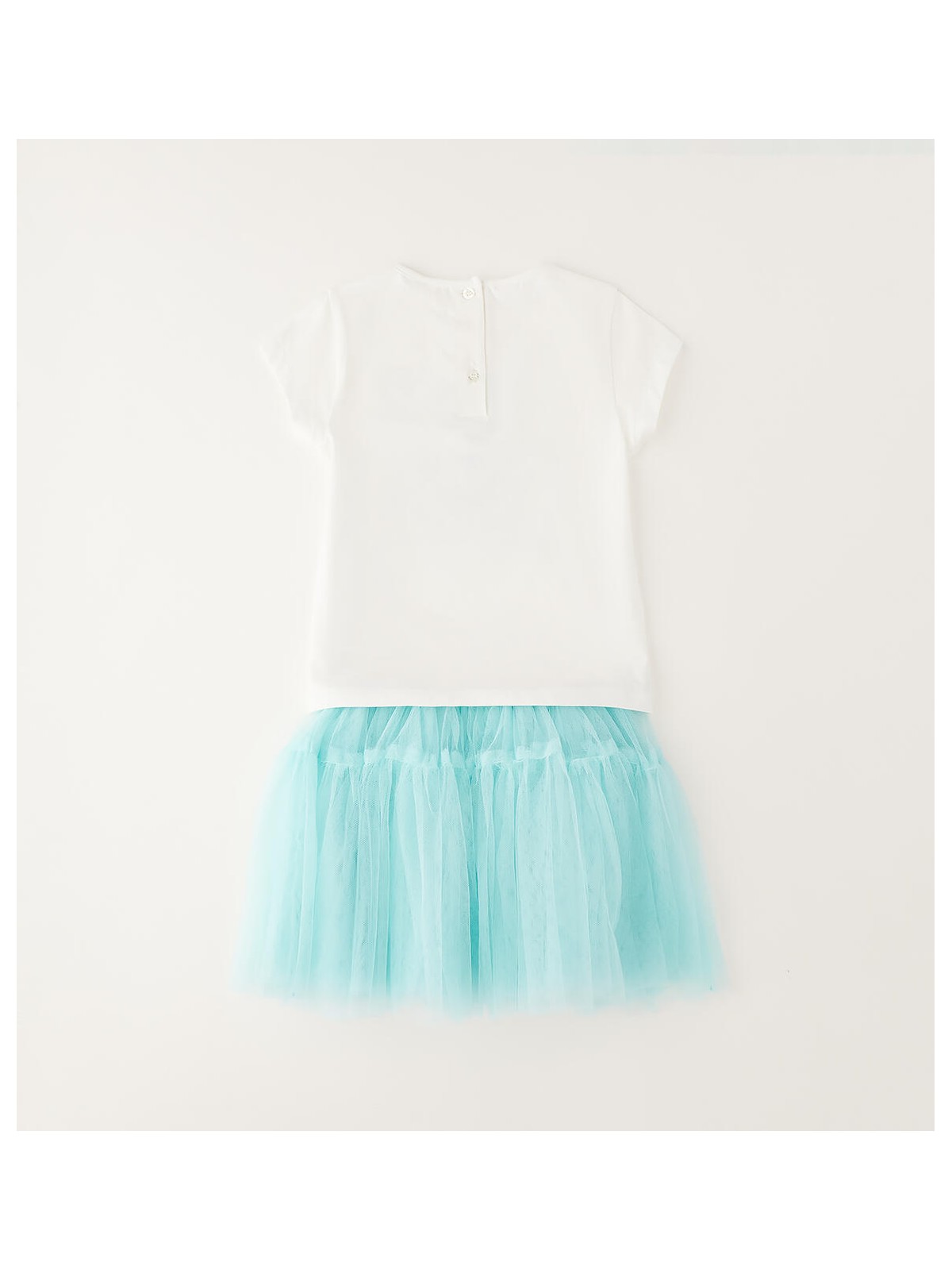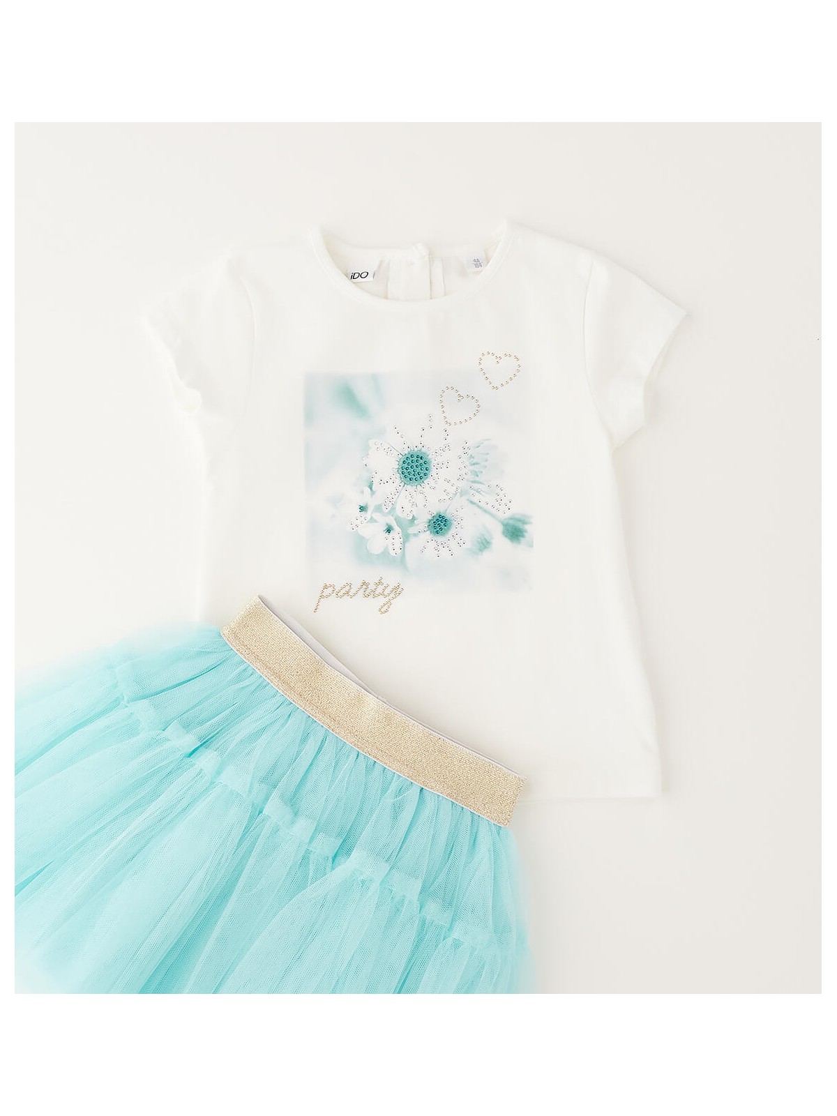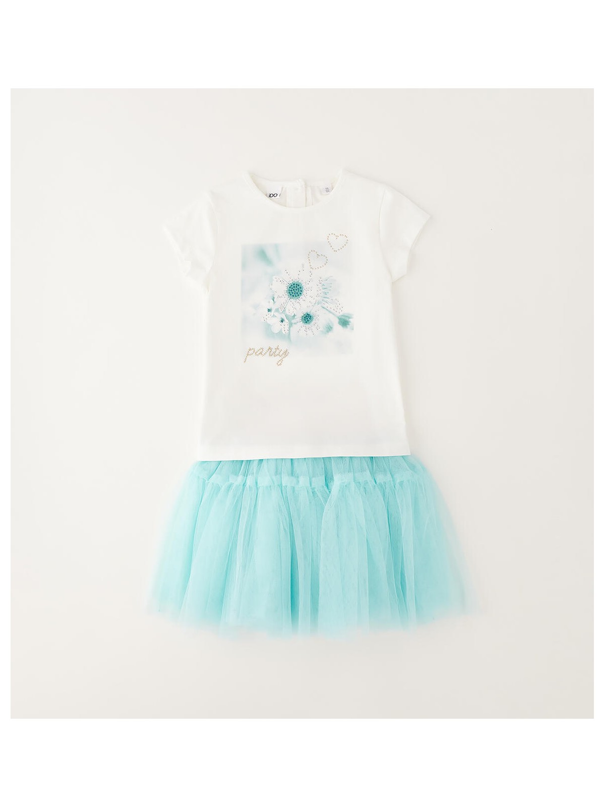 Completo manica corta per bambina iDO composto da t-shirt e gonna. La maglietta è in jersey stretch di cotone con stampa illuminata da strass. La gonna è in tulle con elastico lurex e fodera in cotone. Lunghezza al ginocchio.