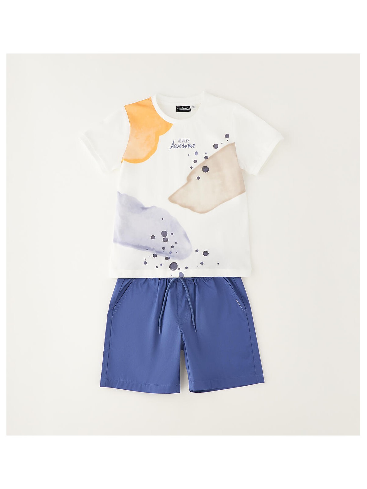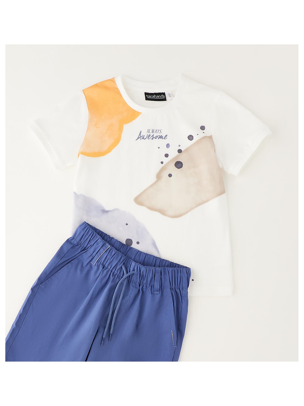 Completo estivo per bambino Sarabanda 100% cotone. T-shirt in jersey con stampa davanti. Pantalone corto in popeline con elastico in vita e coulisse. Lunghezza al ginocchio