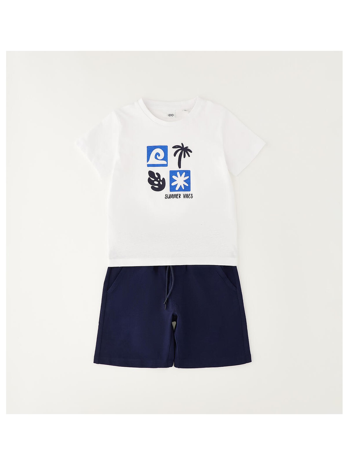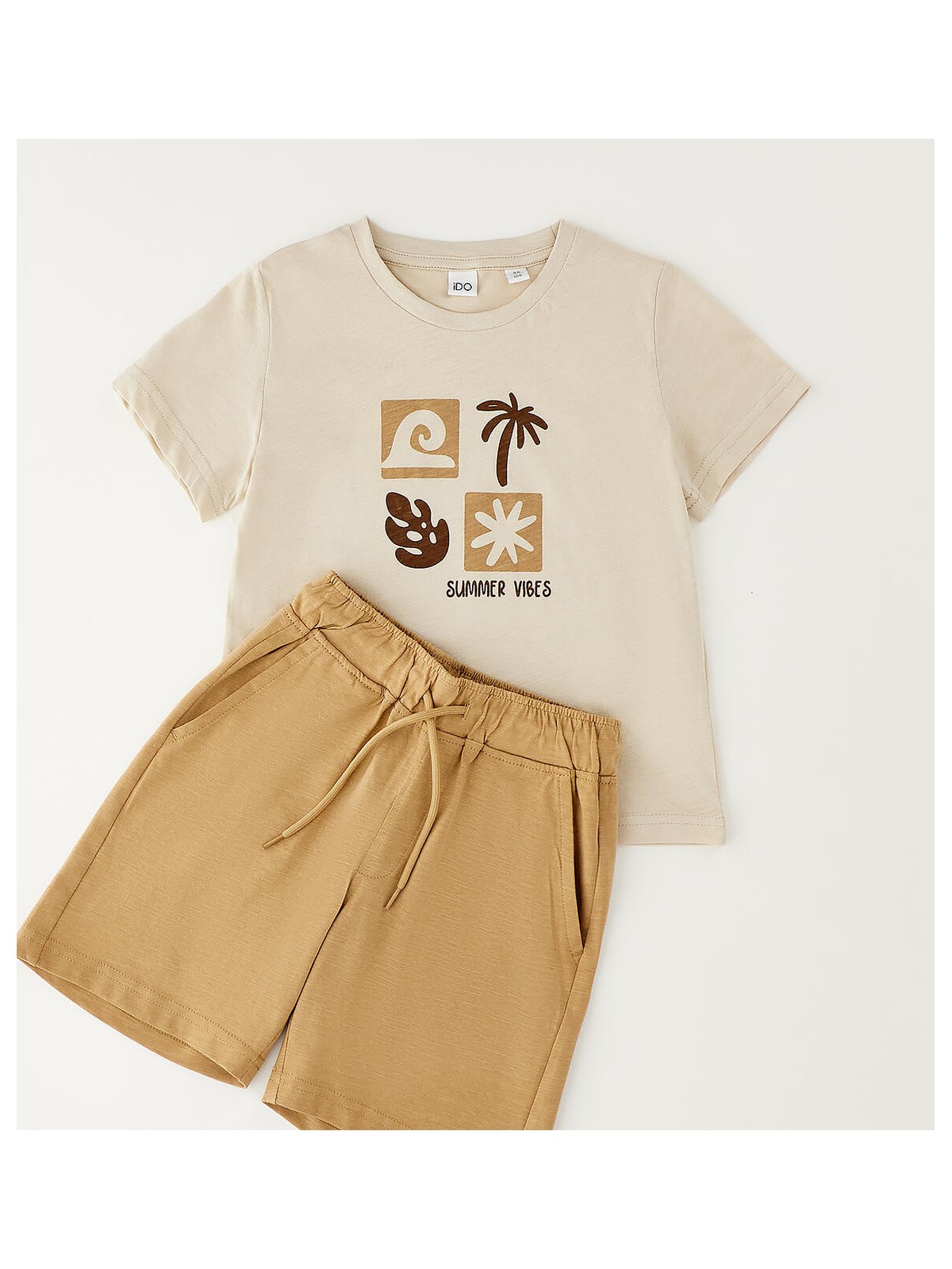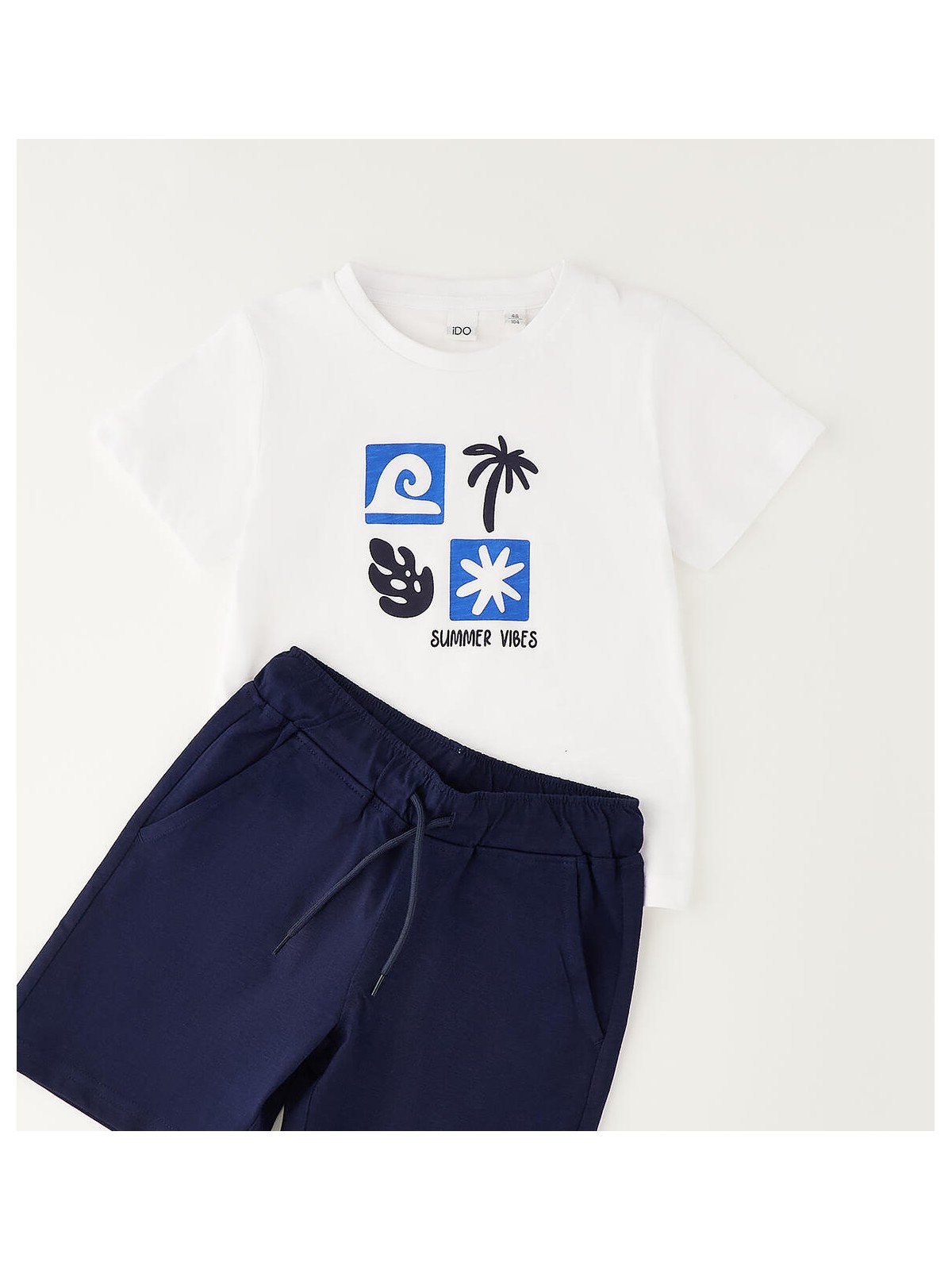Completo manica corta per bambino iDO realizzato in jersey 100% cotone. T-shirt con stampa. Pantalone con elastico in vita e coulisse. Lunghezza al ginocchio.
