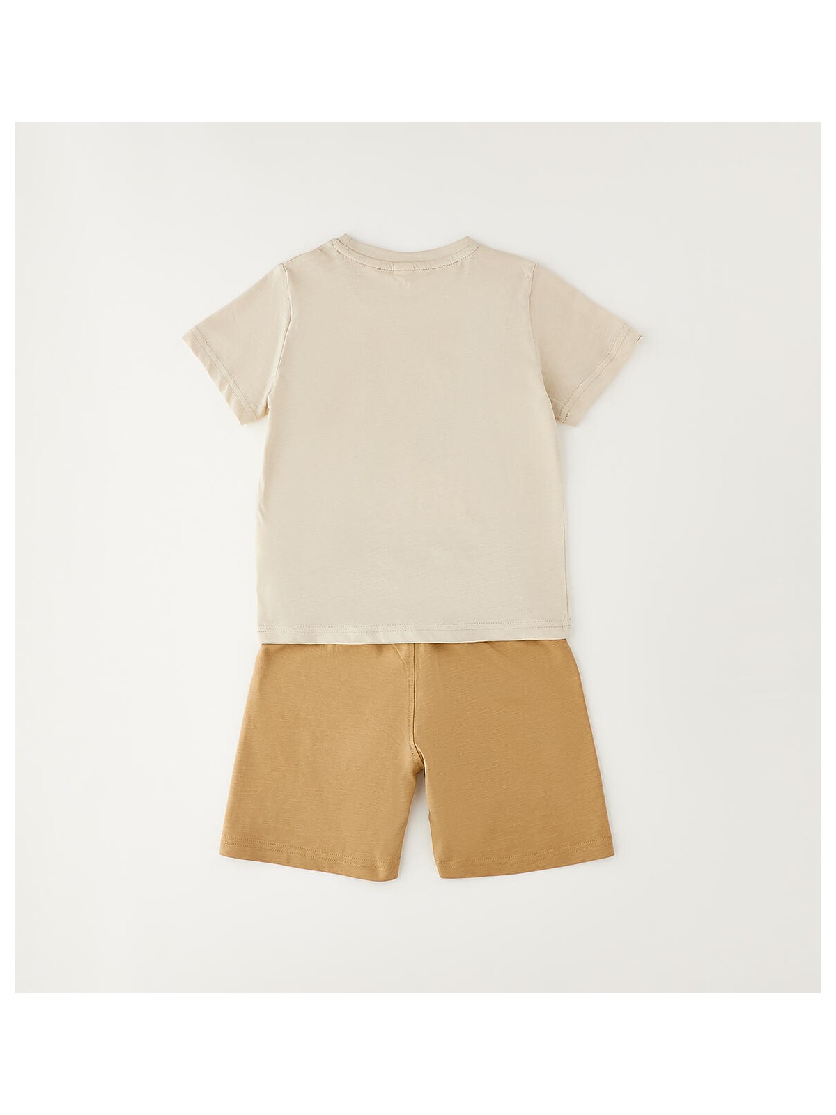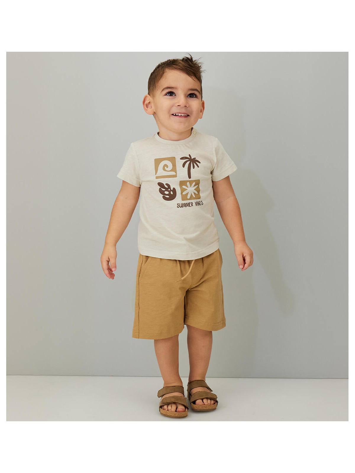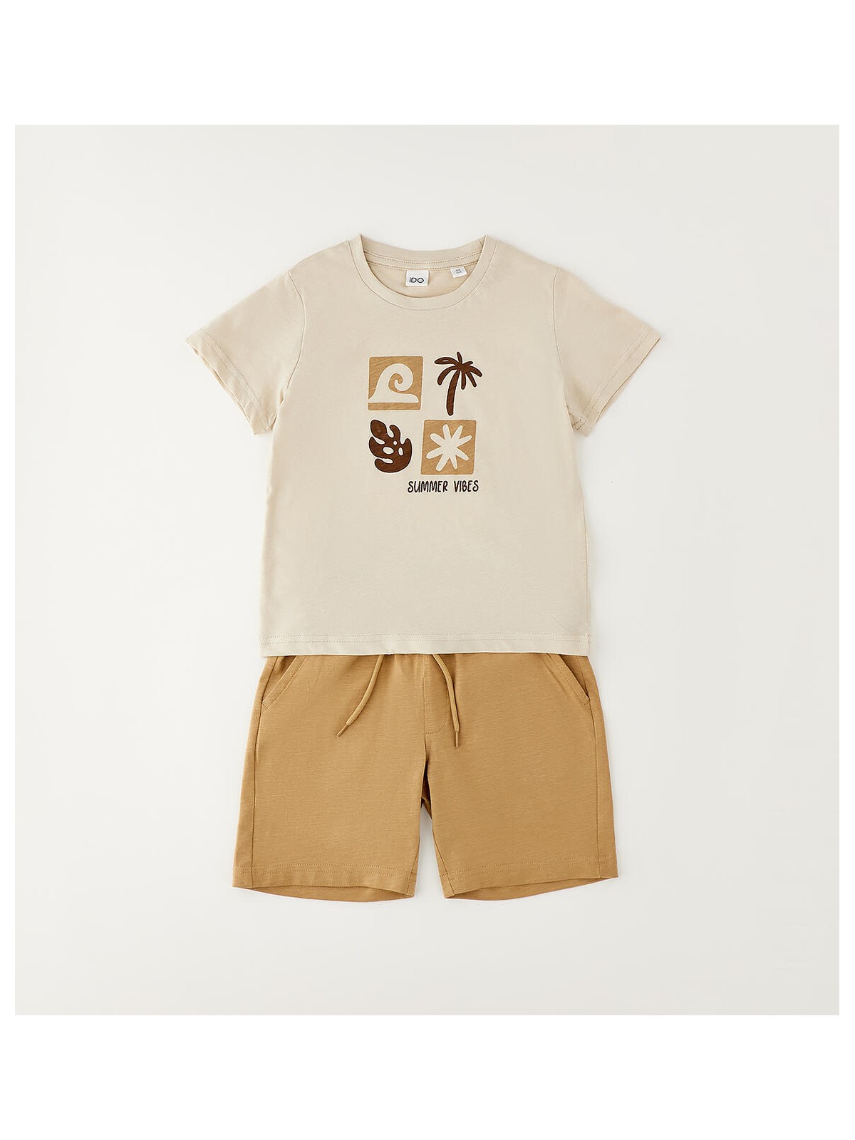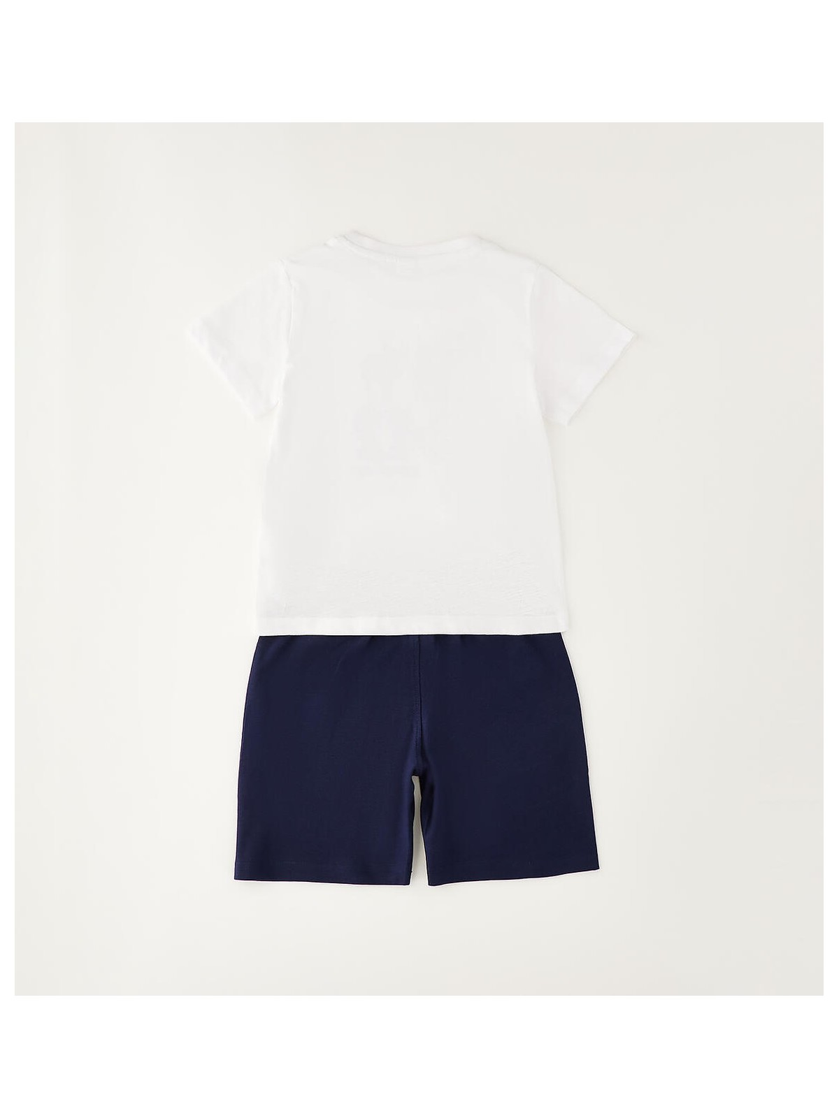 Completo manica corta per bambino iDO realizzato in jersey 100% cotone. T-shirt con stampa. Pantalone con elastico in vita e coulisse. Lunghezza al ginocchio.