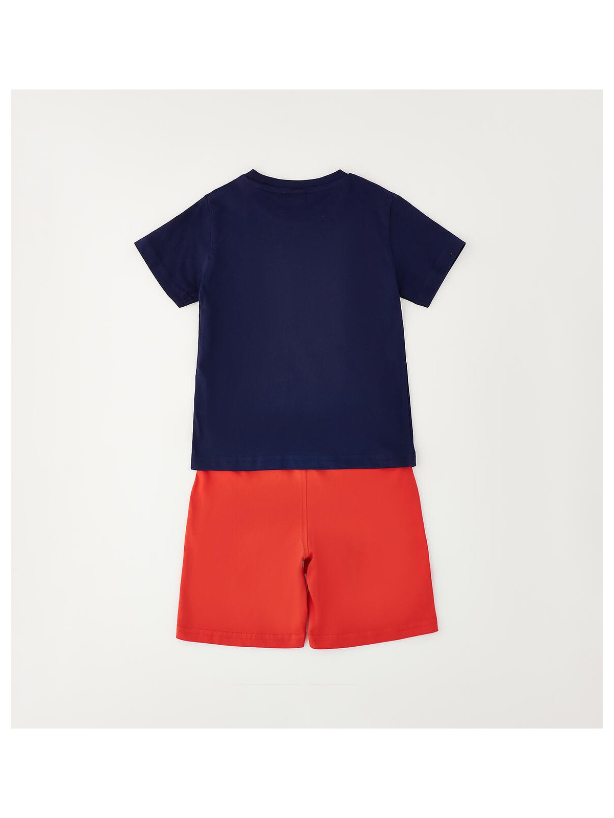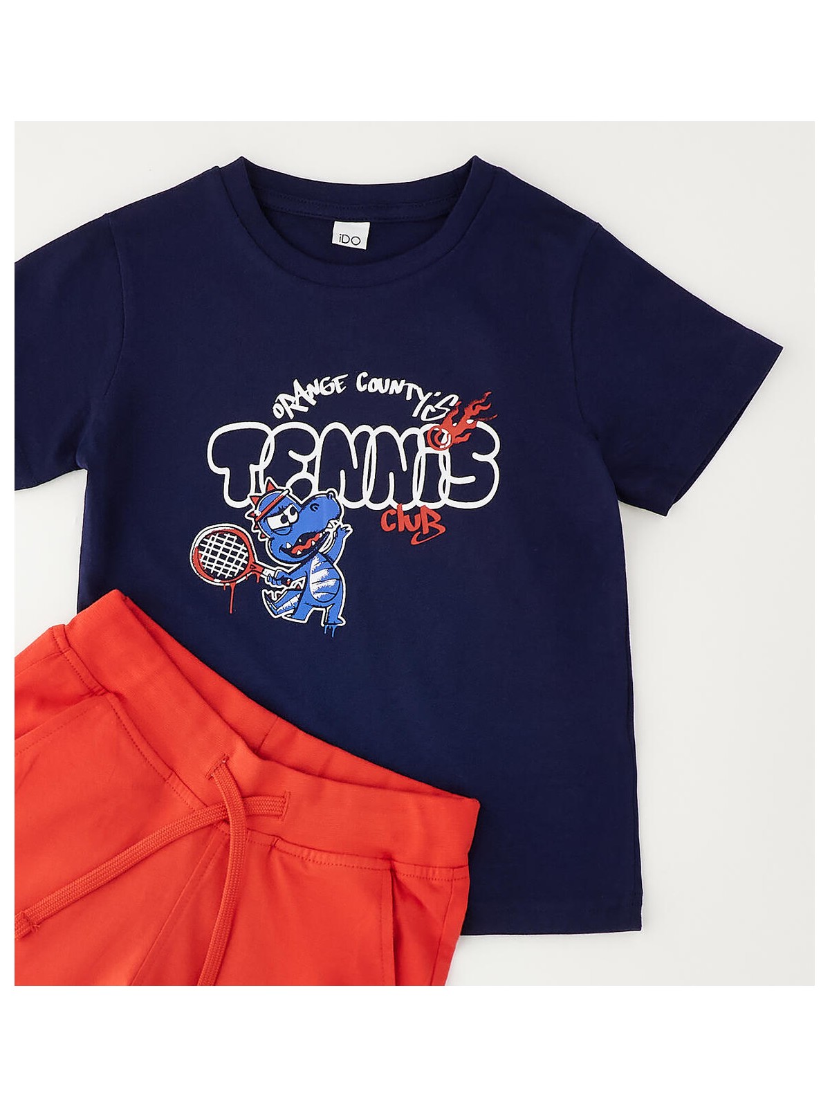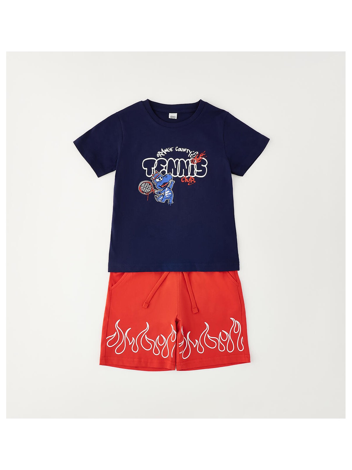 Completo manica corta per bambino iDO realizzato in jersey 100% cotone. T-shirt con stampa. Pantalone con elastico in vita e coulisse. Lunghezza al ginocchio.