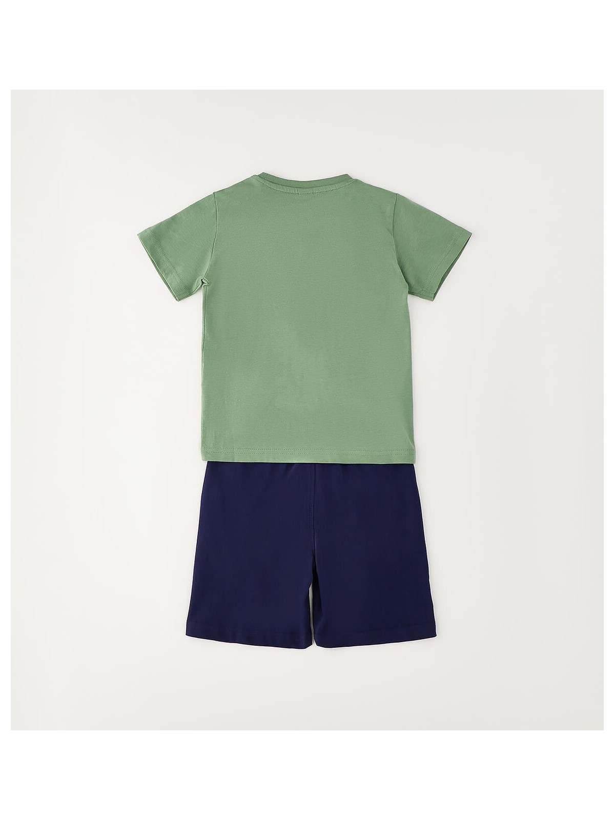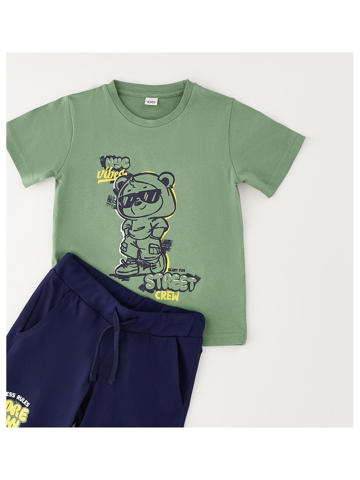 Completo manica corta per bambino iDO realizzato in jersey 100% cotone. T-shirt con stampa. Pantalone con elastico in vita e coulisse. Lunghezza al ginocchio.